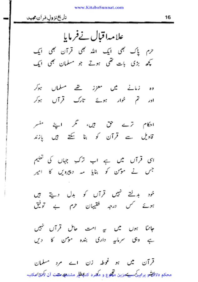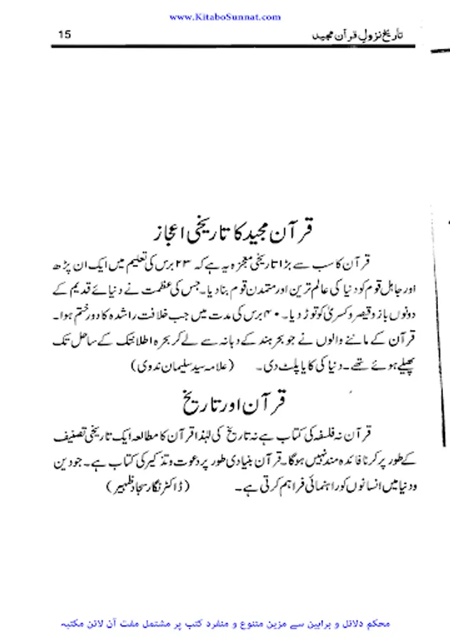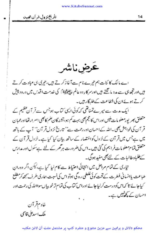 قرآن یا قرآن مجید (عربی میں القرآن الكريم) اسلام کی بنیادی کتاب ہے۔ اسلامی عقیدے کے مطابق قرآن عربی زبان میں تقریباً 23 برس کے عرصے میں محمدﷺ پر نازل ہوا۔ قرآن کے نازل ہونے کے عمل کو وحی کہا جاتا ہے۔ اور یہ کتاب مشہور فرشتے حضرت جبرائیل کے ذریعےامام الانبیاء سیدنا محمدﷺ پر نازل ہوئی۔ مسلمانوں کا بنیادی عقیدہ ہے کہ قرآن میں آج تک کوئی کمی بیشی نہیں ہو سکی اور اسے دنیا کی واحد محفوظ کتاب ہونے کی حیثیت حاصل ہے، جس کا حقیقی مفہوم تبدیل نہیں ہو سکا اور تمام دنیا میں کروڑوں کی تعداد میں چھپنے کے با وجود اس کا متن ایک جیسا ہے۔ اس کی ترتیب نزولی نہیں بلکہ محمدﷺ کی بتائی ہوئی ترتیب کے مطابق ہے۔ زیر تبصرہ کتاب ’’تاریخ نزول قرآن‘‘ وطن عزیز پاکستان کے معروف سیرت نگار و مؤرخ، کالم نگار مصنف کتب کثیرہ جناب مولانا عبد الرشید عراقی ﷾ کی تصنیف ہے۔ اس کتاب میں انہوں نے قرآن مجید کے نزول کو اختصار کے ساتھ بیان کیا ہے اور نزول قرآن کے متعلق تمام معلومات کو یکجا کردیا ہے۔ یہ کتاب سکول اور مدارس کے طلبہ و طالبات اور عام قارئین کے لیے بڑی اہم اور مفید ہے۔ (م۔ا).