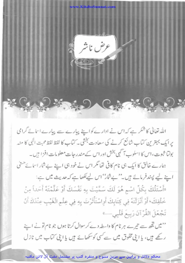 اللہ تعالی ٰ کے با برکت نام او رصفات جن کی پہچان اصل توحید ہے ،کیونکہ ان صفات کی صحیح معرفت سے ذاتِ باری تعالیٰ کی معرفت حاصل ہوتی ہے۔ عقیدۂ توحید کی معرفت اور اس پر تاحیات قائم ودائم رہنا ہی اصلِ دین ہے۔ اور اسی پیغامِ توحیدکو پہنچانے اور سمجھانے کی خاطر انبیاء و رسل کومبعوث کیا گیا او رکتابیں اتاری گئیں۔ اللہ تعالیٰ کےناموں او رصفات کے حوالے سے توحید کی اس مستقل قسم کوتوحید الاسماء والصفات کہاجاتاہے۔ قرآن واحادیث میں اسماء الحسنٰی کوپڑھنے یاد کرنے کی فضیلت بیان کی گئی ہے۔ارشاد باری تعالیٰ ہے۔’’ وَلِلَّهِ الْأَسْمَاءُ الْحُسْنَى فَادْعُوهُ بِهَا‘‘اور اللہ تعالیٰ کے اچھے نام ہیں تو اس کوانہی ناموں سےپکارو۔اور اسی طرح ارشاد نبویﷺ ہے«إِنَّ لله تِسْعَةً وَتِسْعِينَ اسْمًا مِائَةً إِلَّا وَاحِدًا، مَنْ أَحْصَاهَا دَخَلَ الجَنَّةَ»یقیناً اللہ تعالیٰ کے نناوےنام ہیں یعنی ایک کم 100 جس نےان کو یاد (یعنی پڑھنا سمجھنا،یادکرنا) کیا وہ جنت میں داخل ہوگا۔(صحیح بخاری )اسماء الحسنٰی کے سلسلے میں اہل علم نے عربی اردو زبان میں مستقل کتب تصنیف کی ہیں اور بعض نے ان اسماء کی شرح بھی کی ہے۔ زیر تبصرہ کتاب ’’تیرے نام تیری پہچان‘‘ بھی اسی سلسلہ کی ایک کڑی ہے۔ یہ کتاب محترمہ ساجدہ ناہید اور محترمہ بشریٰ تسنیم کی مشترکہ کاوش ہے ۔انہوں نے اس کتاب میں قرآن وسنت کے علاوہ مستند ائمہ محدثین اور علماء کی تشریحات کو بھی نقل کرتے ہوئے صفات الٰہی سے استفادے پر بہترین تجاویز بھی پیش کی ہیں۔ یہ کتاب اپنے موضوع کی بہت سے عربی اور اردو کتب کا حسین مرقع ہے۔ مرتبین نے قرآنی اسلوب کو مد نظر رکھتے ہوئے اس کتاب کااندازِ تحریر کبھی خطاب، کبھی متکلم او رکبھی انذار وتبشیر کا اختیار کیا ہے اور تاریخی واقعات اور مثالوں سے سبق حاصل کرنےکی بھرپور کوشش کی گئی ہے۔ اللہ تعالیٰ دونوں خواتین کی اس اہم کو کاوش کو قبول فرمائے اور اسے عامۃ الناس کے نفع بخش بنائے۔ (آمین) (آمین).