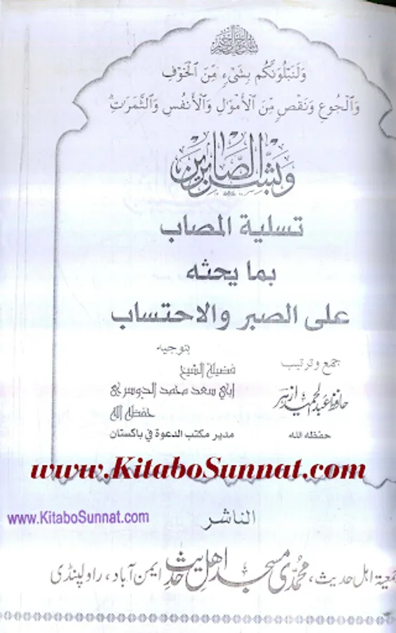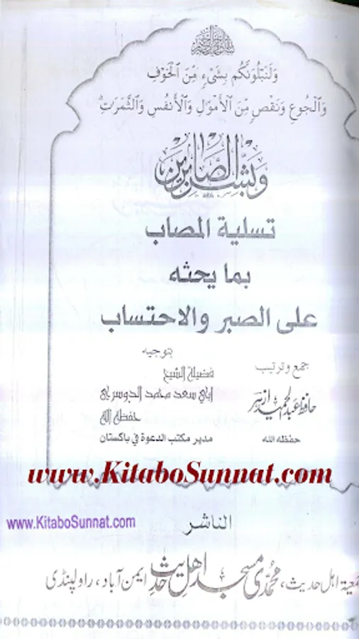 صبر کے معنی ہیں کسی خوشی ، مُصیبت ، غم اور پریشانی وغیرہ کے وقت میں خود کو قابو میں رکھنا اور خلاف شریعت کاموں سے بچنا ہے۔ صبرکی اہمیت کااندازہ اس بات سے لگایاجاسکتا ہے کہ قرآن پاک میں ستر بار اس کاذکر آیا ہے۔ہم نے اپنی زندگیوں میں شایدصبرکااستعمال ترک کر دیا ہے ۔ اس لئے ہم فرسٹریشن،ڈیپریشن یا ٹینشن جیسی مہلک امراض میں مبتلاہورہے ہیں۔ حالاں کہ صبرکااوراس کائناتی اور دنیاوی نظام کاآپس میں بڑا گہراتعلق ہے۔کائنات کے ہر عمل میں صبرکی آمیزش ہے۔ مثلاًچاندستارے اپنے اپنے مدار میں رہتے ہوئے اپناسفرطے کر تے ہیں اوررات کو دن اوردن کورات میںبدلتے ہیں ۔ا یک پودامکمل درخت راتوں رات نہیں بن جاتا ۔آہستہ آہستہ پروان چڑھتا ہے۔ پہلے پھول اورپھرپھل آتے ہیں ۔ یہ کائناتی ربط ہمیں سکھاتا ہے کہ ہم اپنی زندگیوں میں بھی اسے شامل کر کے زندگی میں ربط پیداکریں۔اگرہم دنیاوی تناظرمیں بھی دیکھیں توکسی بھی منزل کوپانے کے لئے ہرانسان کوبہرصورت صبرکی سیڑھی پر چڑھنا پڑتا ہے۔ا یک ڈاکٹرکو بھی اپنی ڈگری لینے کے لئے پانچ سال تک انتظارکرنا پڑتا ہے۔گویا یہ صبرہی ہے کہ جو منزل بہ منزل اسے ایک بڑے رتبے سے نوازتا ہے ۔ کسی بھی شے یا شعبے میں لمحہ بہ لمحہ ترقی حاصل ہو تی ہے ۔ اگر انسان صبر نہیں کر تاتووہ مایوسی کا شکارہوجاتاہے۔ زیر تبصرہ کتاب" وبشر الصابرین "مکتب الدعوہ اسلام آباد پاکستان کے مدیر ابو سعد محمد الدوسری کی فرمائش پر محترم مولانا حافظ عبد الحمیدازہر صاحب نے مرتب فرمائی ہے۔ اللہ تعالی سے دعا ہے کہ وہ مولف موصوف کی اس محنت کو اپنی بارگاہ میں قبول فرمائے اور ان کے میزان حسنات میں اضافہ فرمائے۔آمین(راسخ).