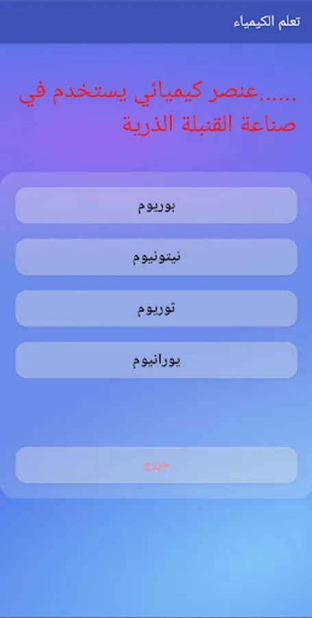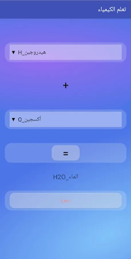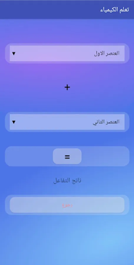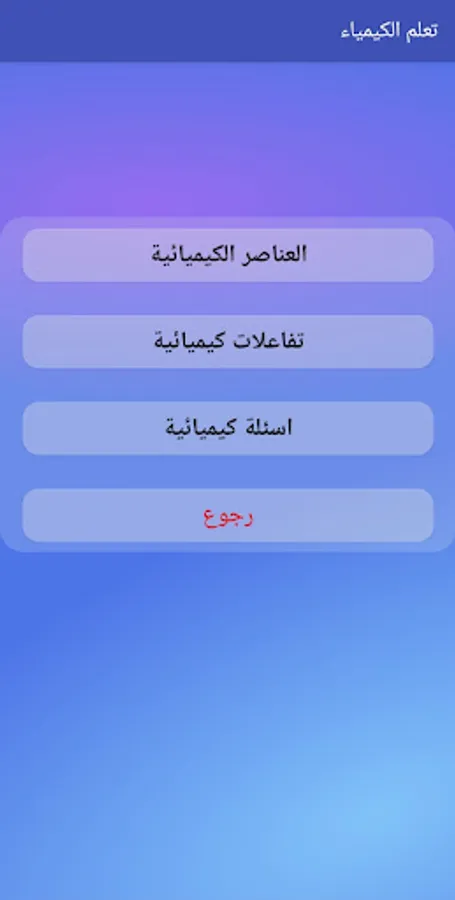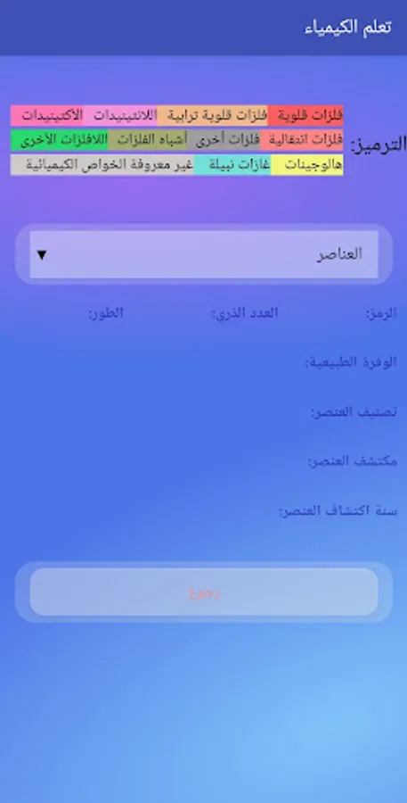 The application is an educational chemical application that contains three lists. The first list is "Chemical Elements" that includes a group of information about chemical elements such as the chemical symbol of an element, its atomic number, phase, etc. The second list is "Chemical Reactions" that includes the most common elements and the interactions that occur between them. The third list is "Chemical Questions" that includes a group of questions related to the science of chemistry.