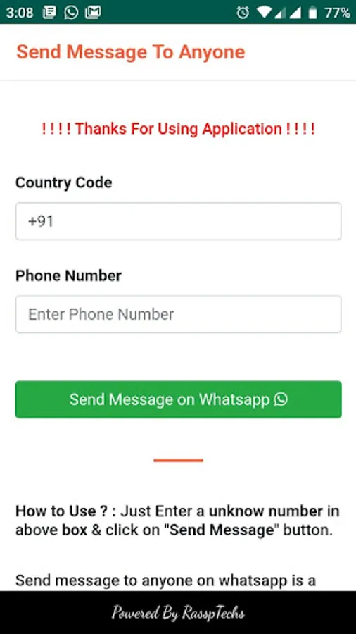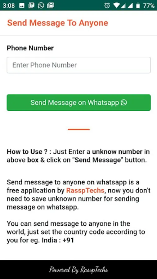Send message to anyone on whatsapp is a free application by RasspTechs, now you don't need to save unknown number for sending message on whatsapp.