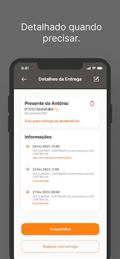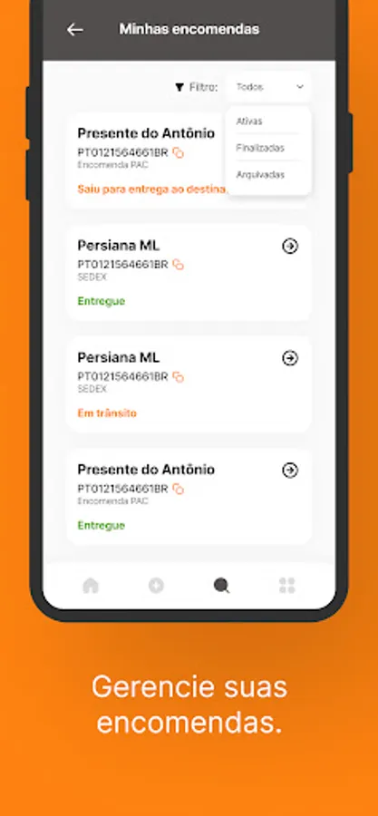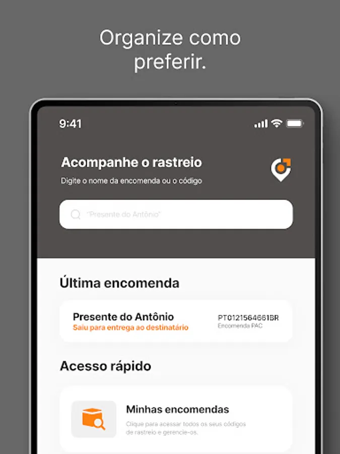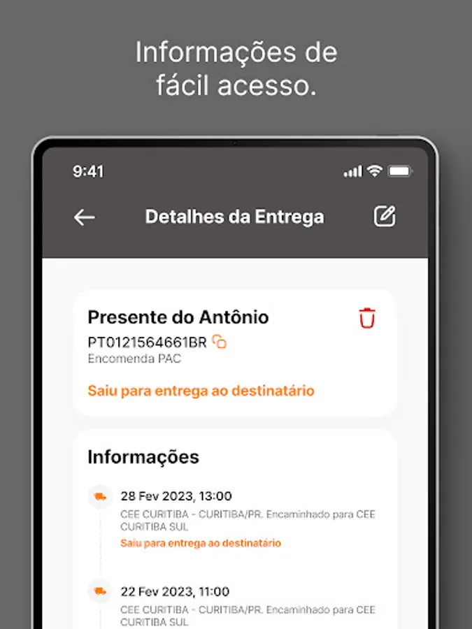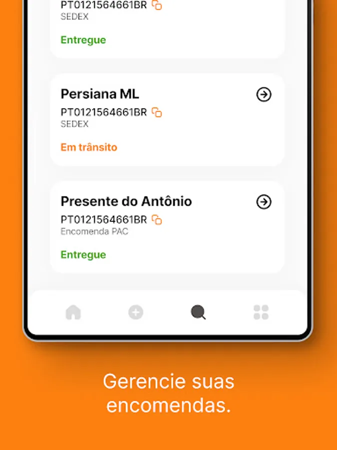 Tracking in one place: Manage the tracking of all your Correios packages in a single application, making it easier to track your orders.