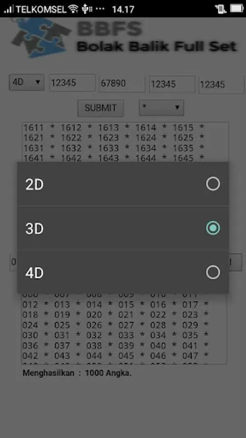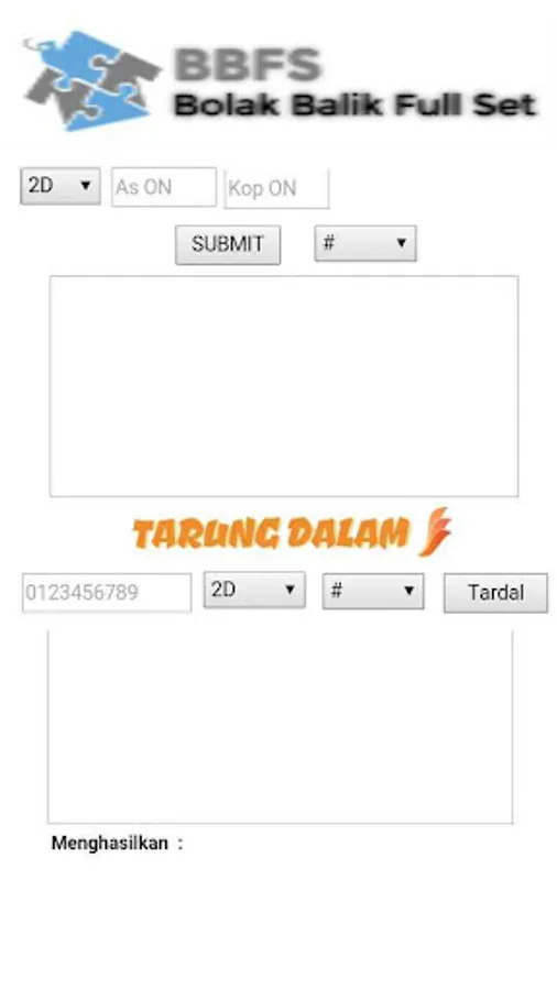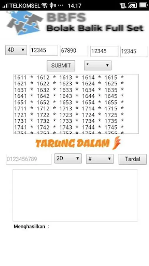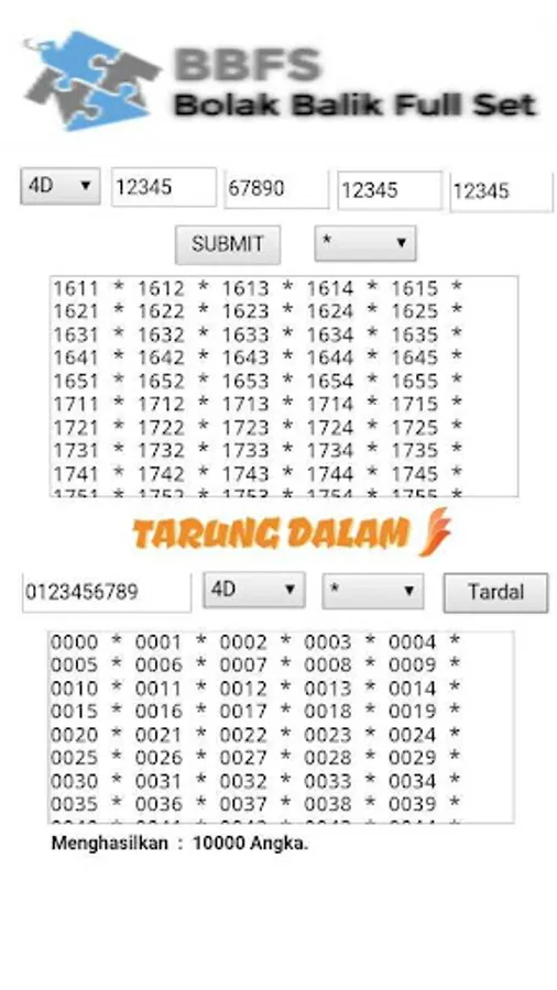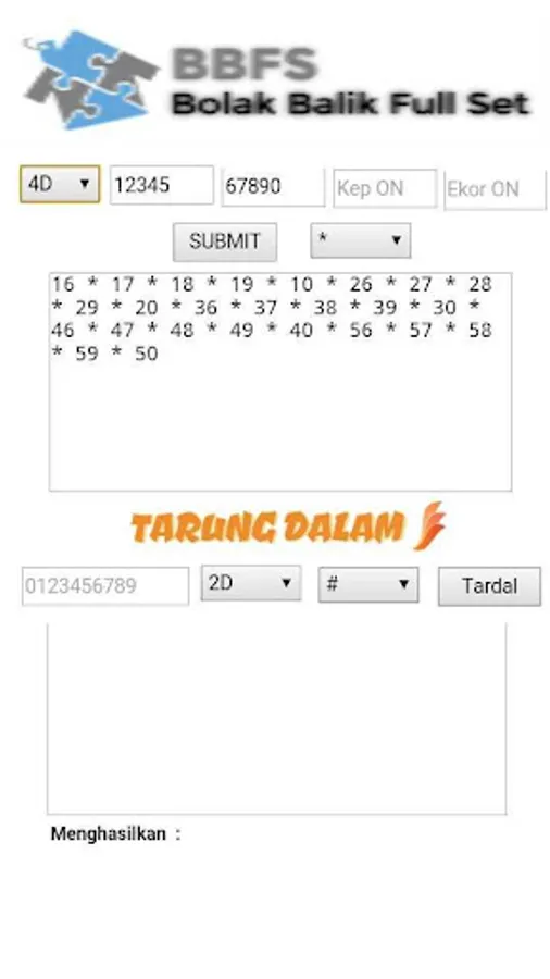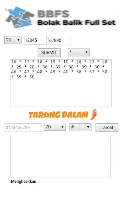 This BBFS GENERATOR was made in order to make it easier for online lottery players to do the betting and is packaged in the form of an application that actually functions to reverse numbers so that they become a full set. And the number capacity in this application is a maximum of 10 digit numbers.