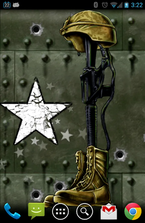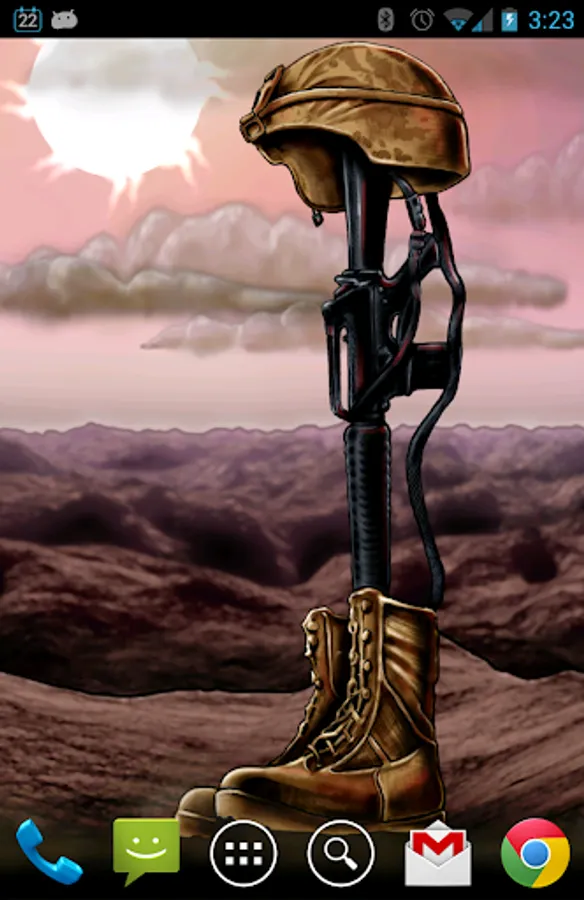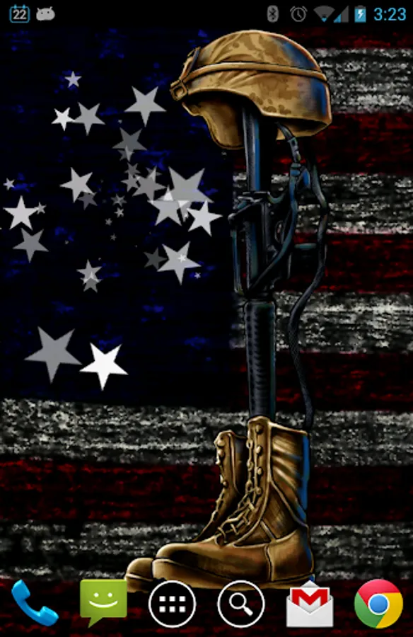 Live Wallpaper featuring a Soldier Memorial theme with 4 peaceful, animated scenes. This is one of Cat's most requested Tattoos, so we've brought it to life as a live wallpaper! The desert scenes feature moving clouds, mist, twinkling stars, and an animated sun and moon. The bomber plane and American flag scenes feature bursting star patterns.