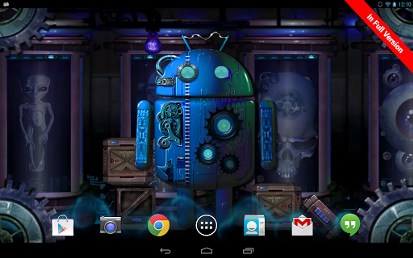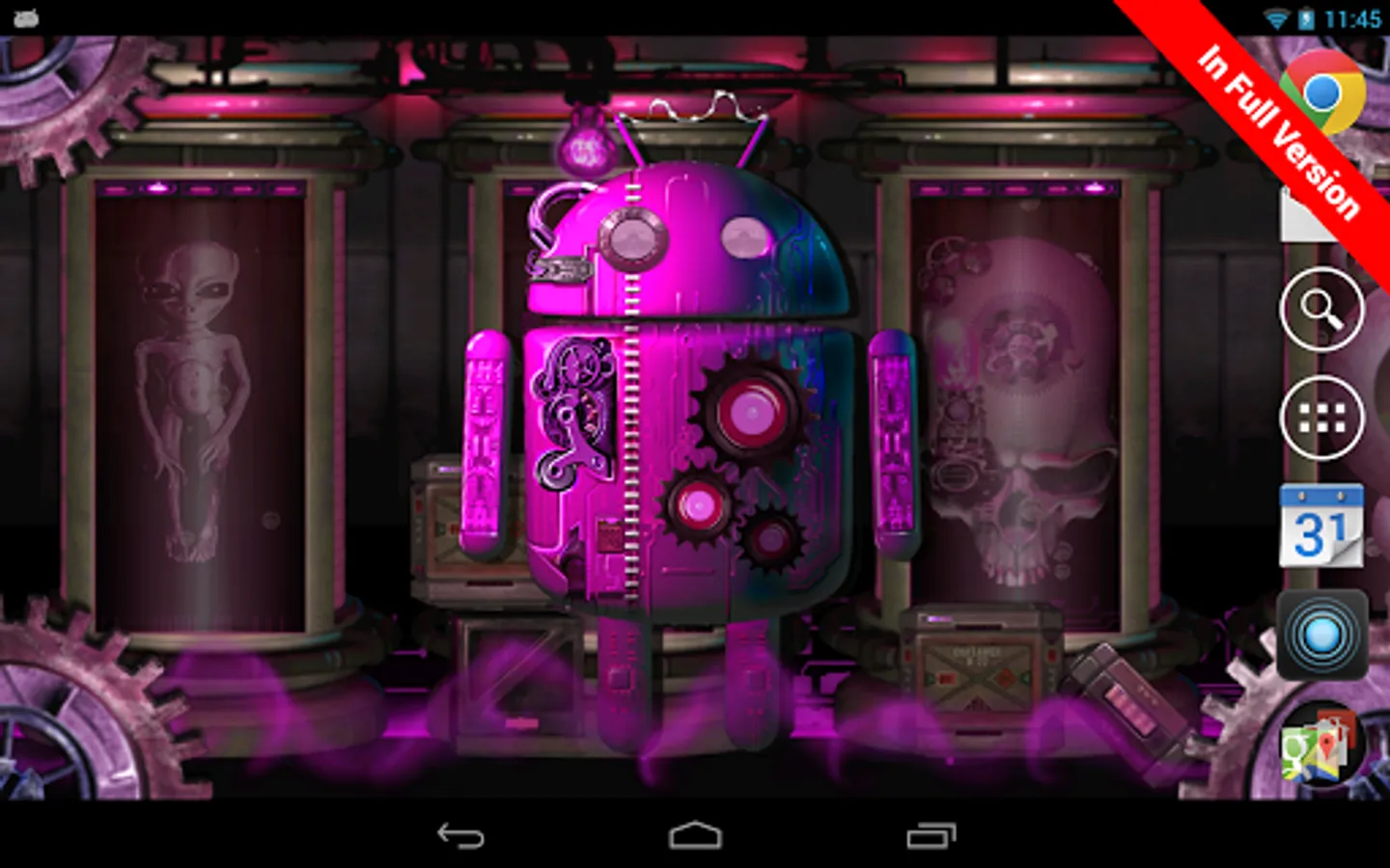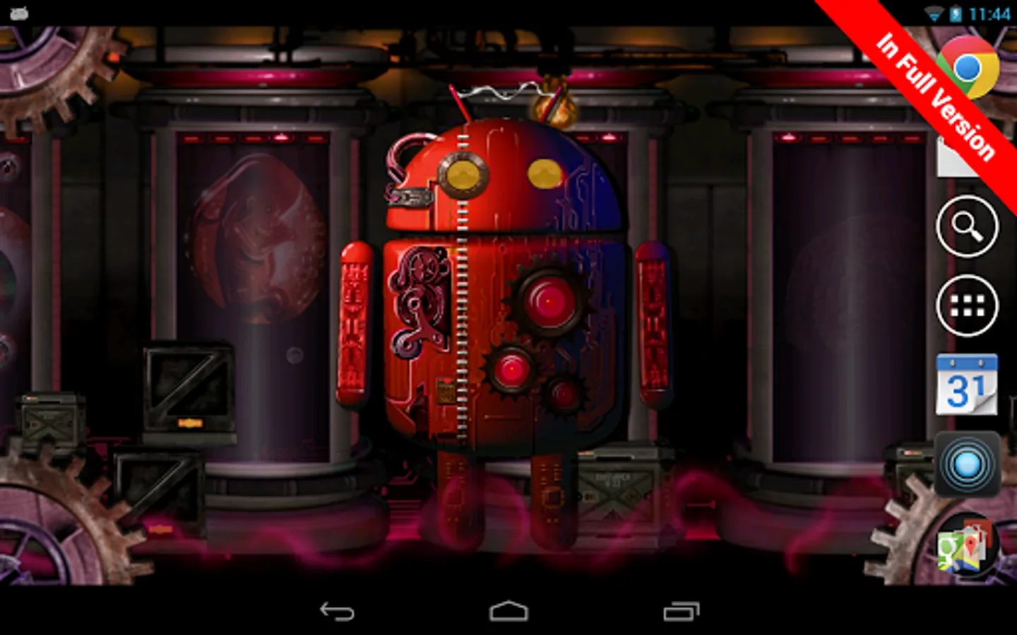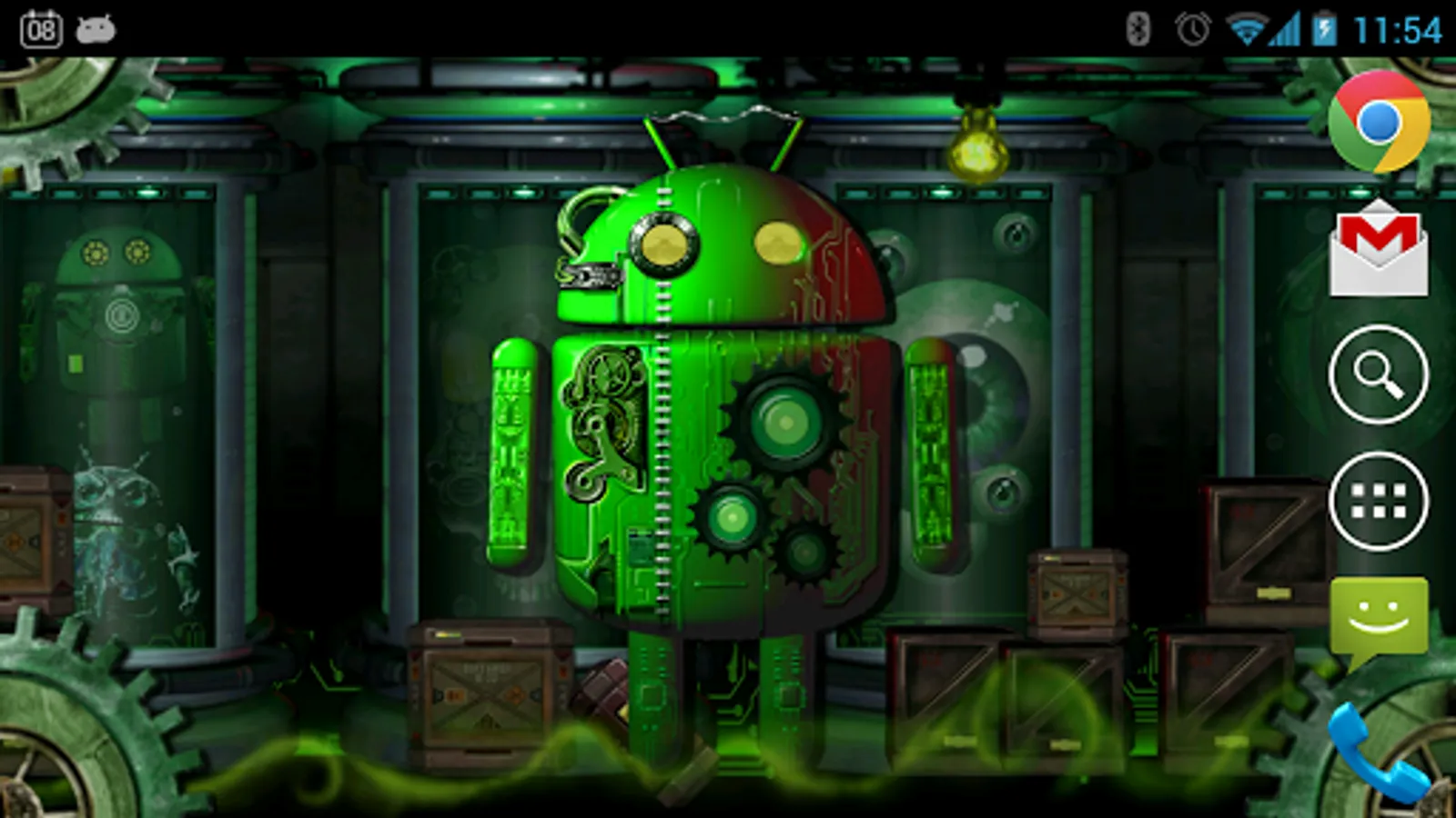 Live Wallpaper featuring a Steampunk Droid Fear Foundry - a droid lab technician hosts bubbling tanks filled with horrors and curiosities. Many details to discover and enjoy. With rotating gears, clockwork, parallax scrolling and interactive touch effects. The gears spin and track your finger movements. The droid has random quirks and expressions and reacts to touch.