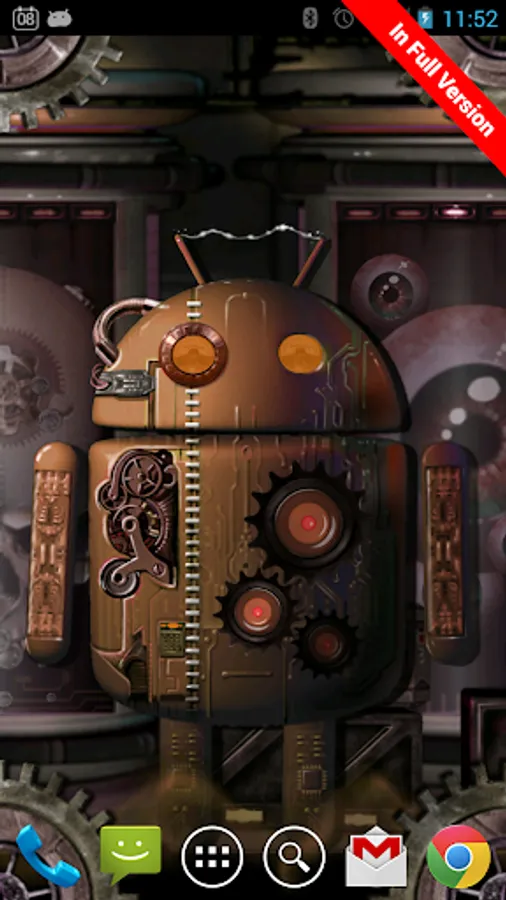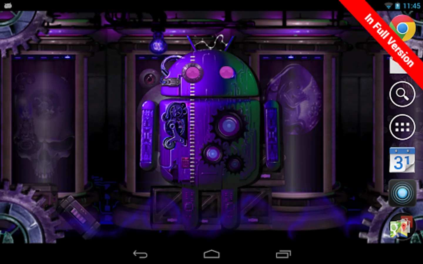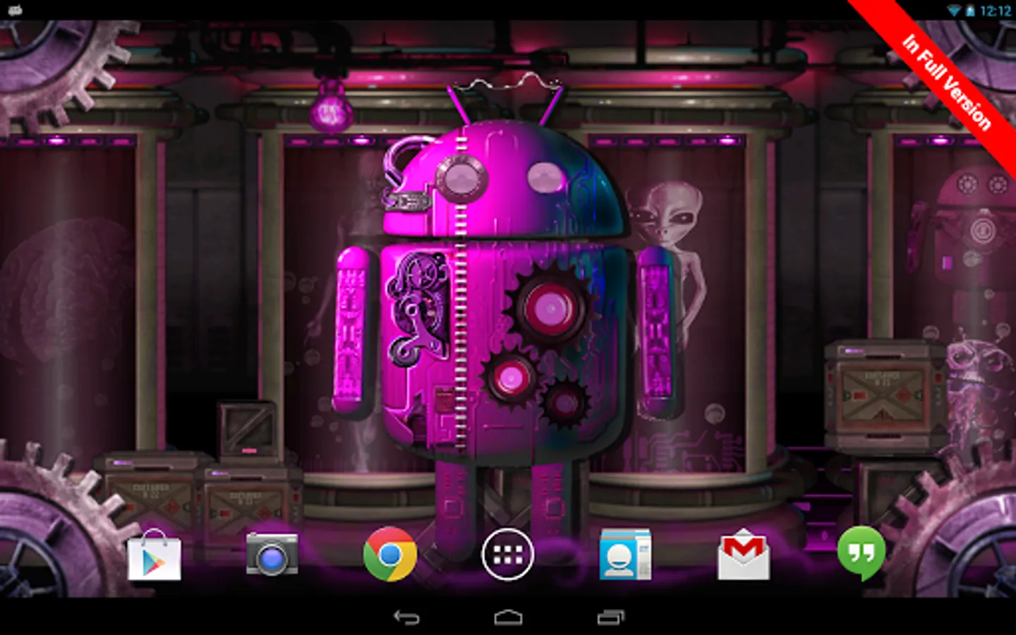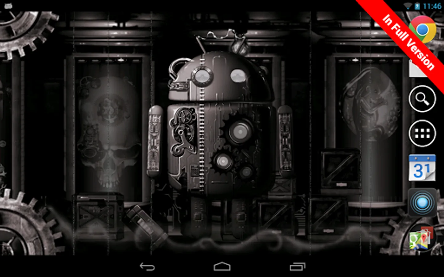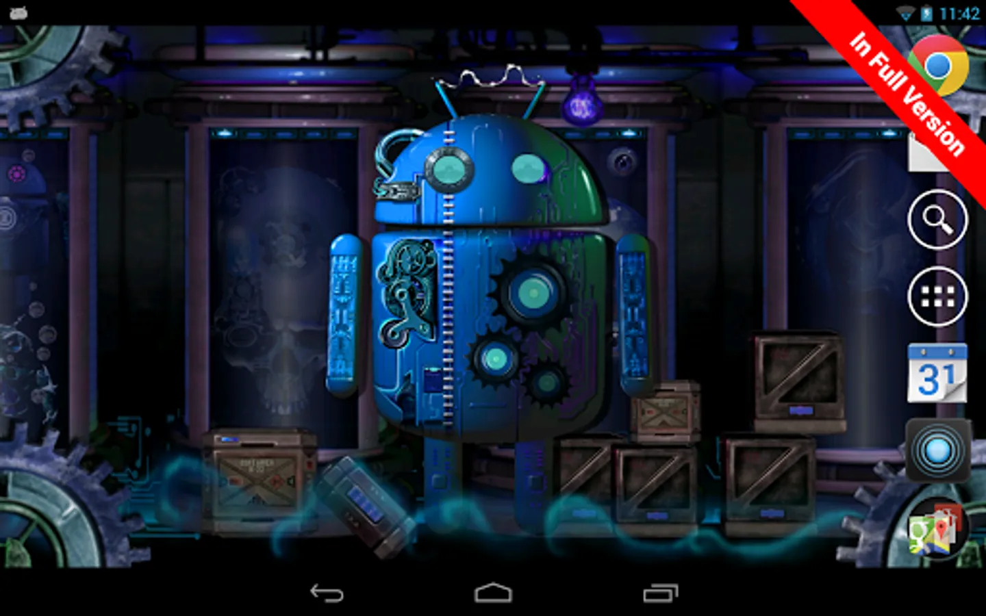 Live Wallpaper featuring a Steampunk Droid Fear Foundry - a droid lab technician hosts bubbling tanks filled with horrors and curiosities. Many details to discover and enjoy. With rotating gears, clockwork, parallax scrolling and interactive touch effects. The gears spin and track your finger movements. The droid has random quirks and expressions and reacts to touch.