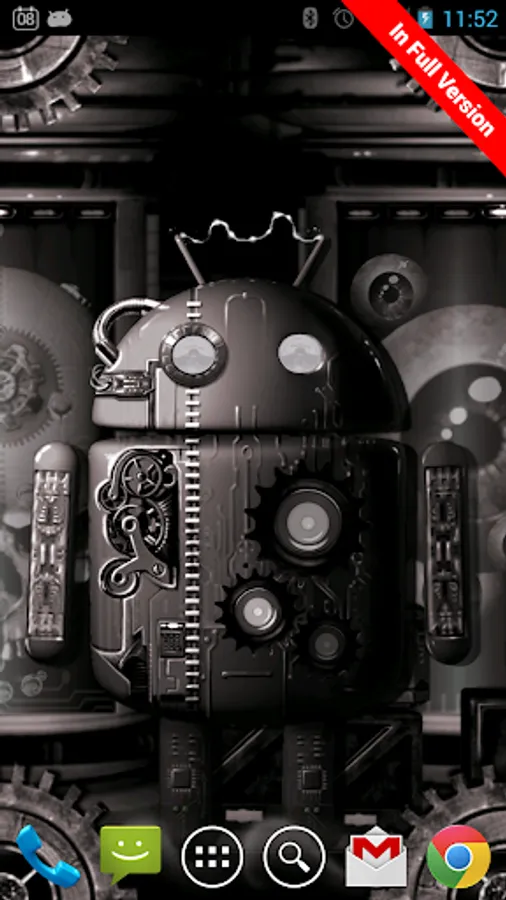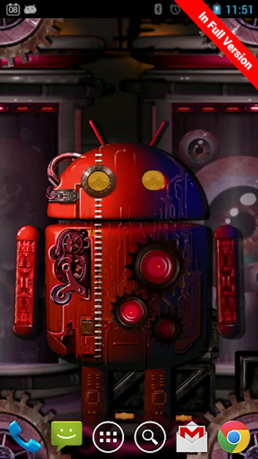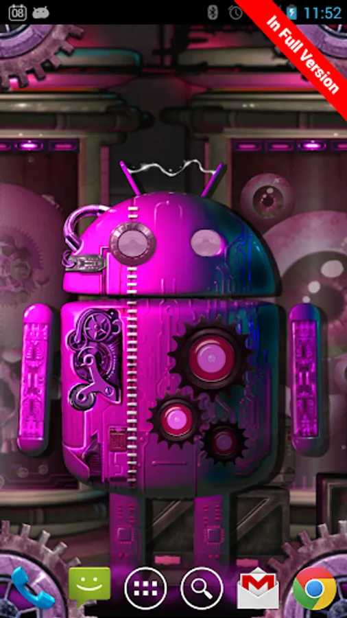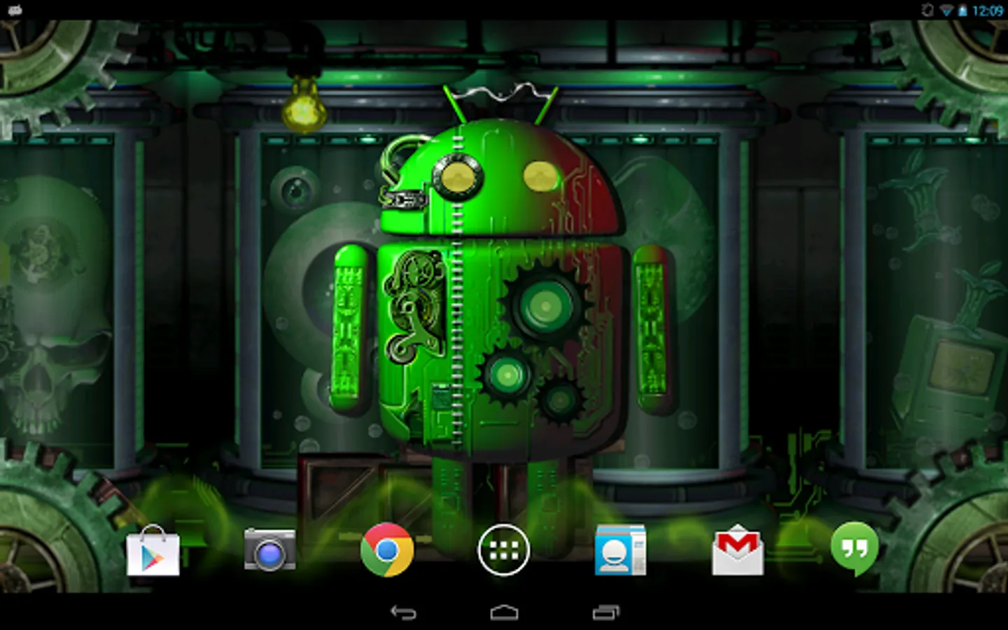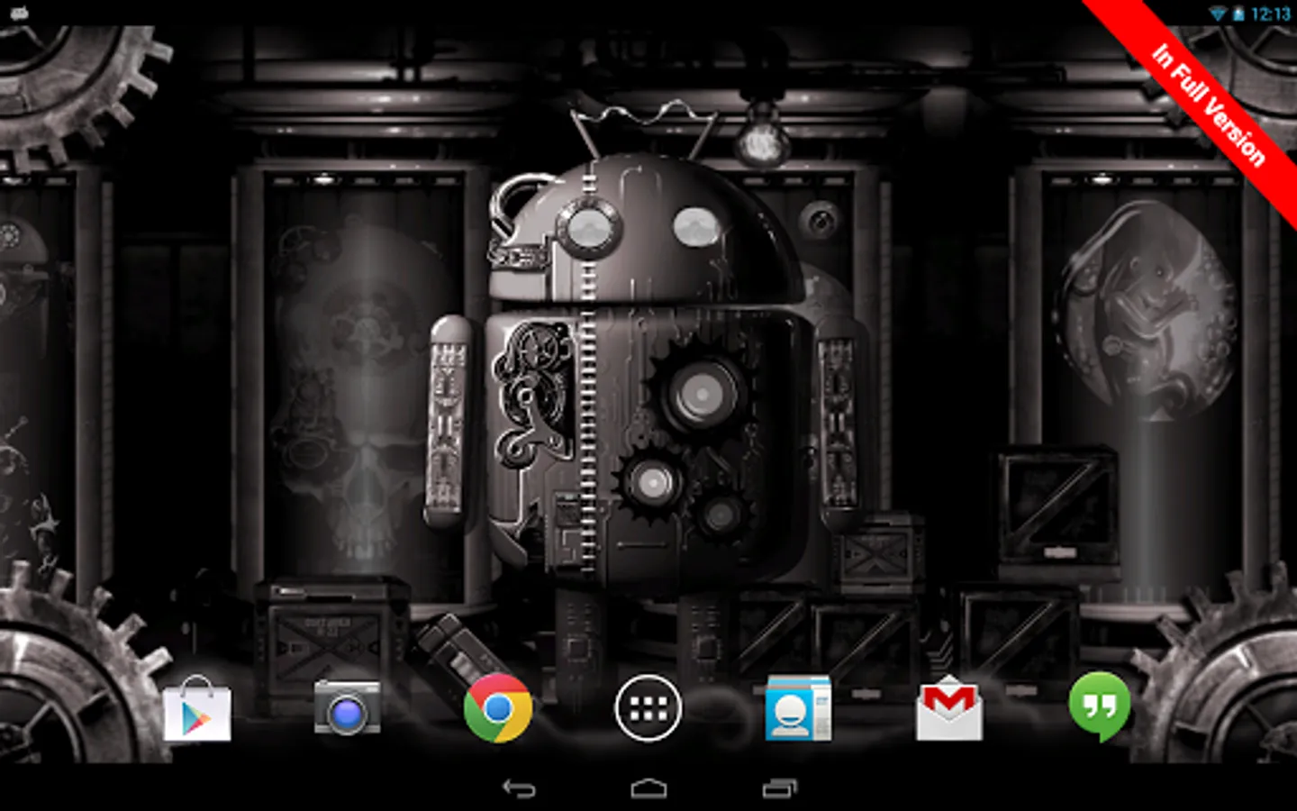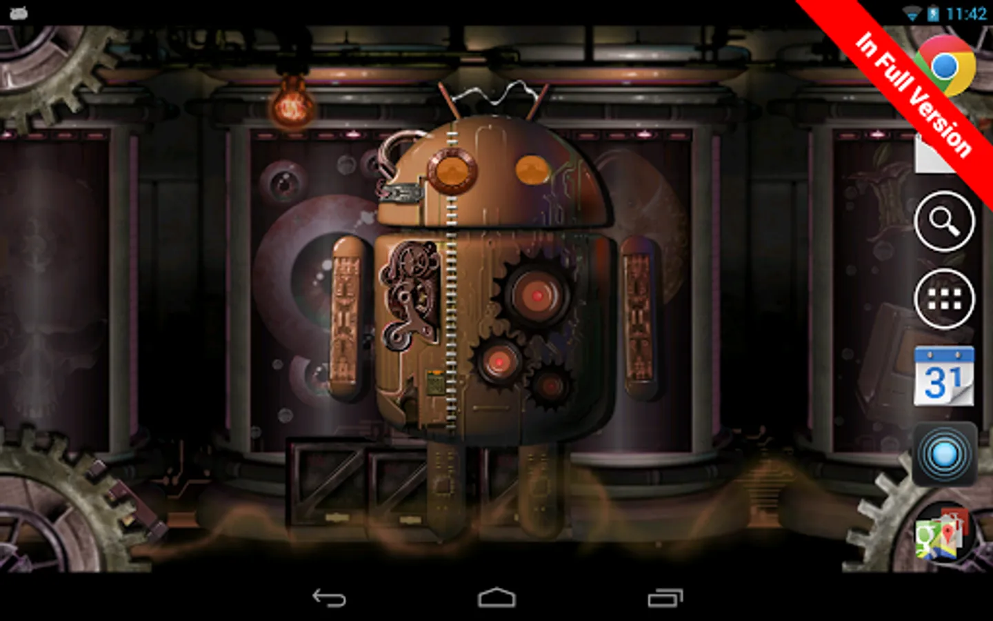 Live Wallpaper featuring a Steampunk Droid Fear Foundry - a droid lab technician hosts bubbling tanks filled with horrors and curiosities. Many details to discover and enjoy. With rotating gears, clockwork, parallax scrolling and interactive touch effects. The gears spin and track your finger movements. The droid has random quirks and expressions and reacts to touch.