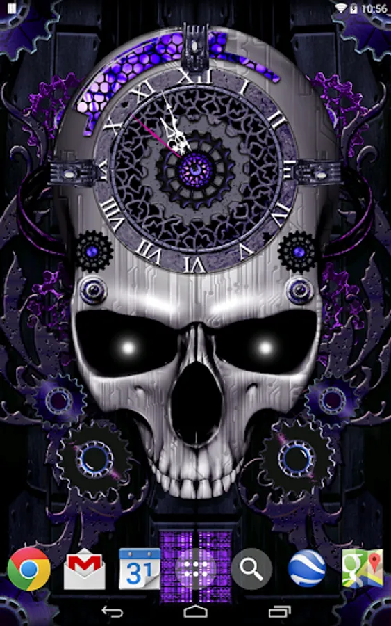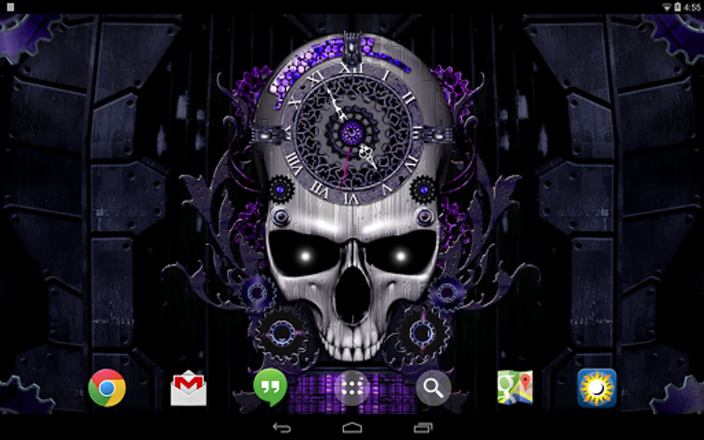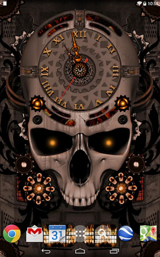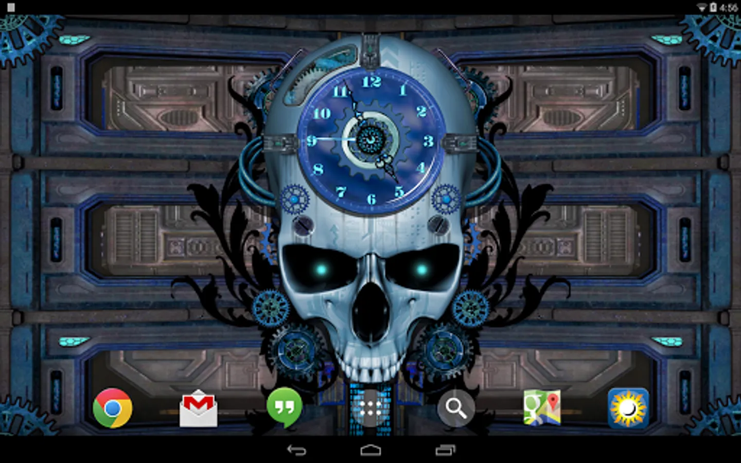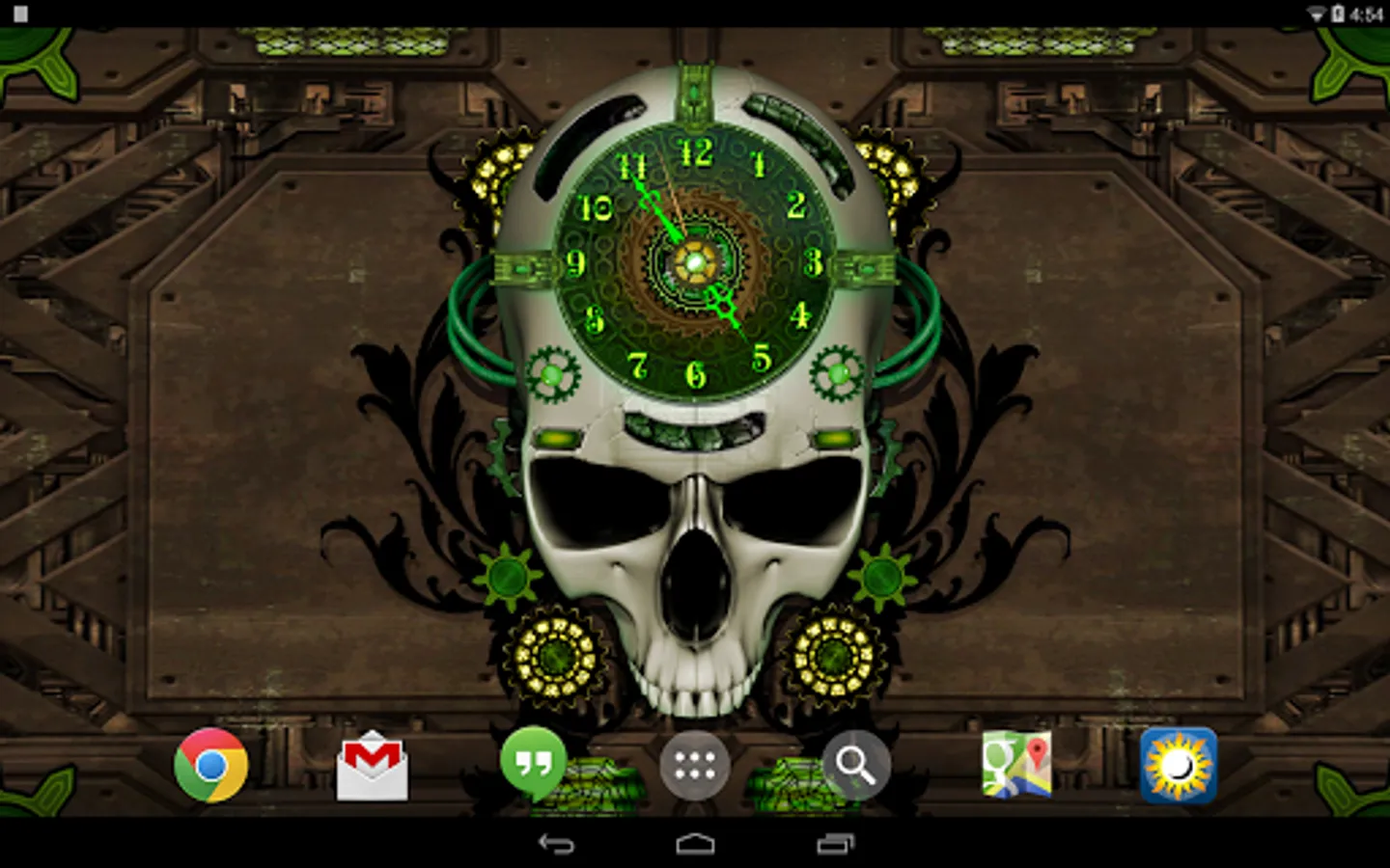 Live Wallpaper featuring a Steampunk Skull Clock with 6 complete themes, rotating gears, animated lights and many customization options. People have been asking for us for a clock, and we're excited to finally bring this to you!