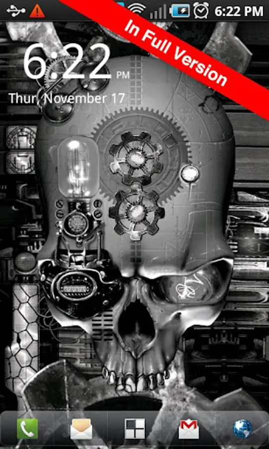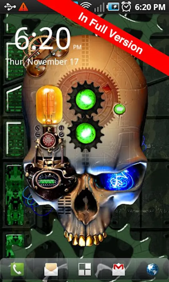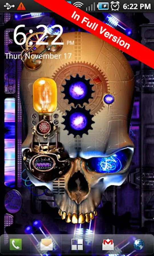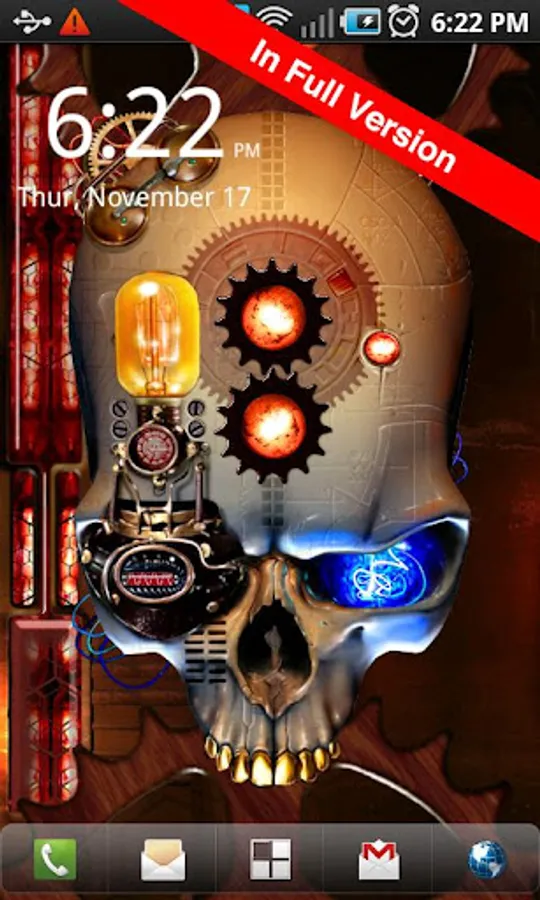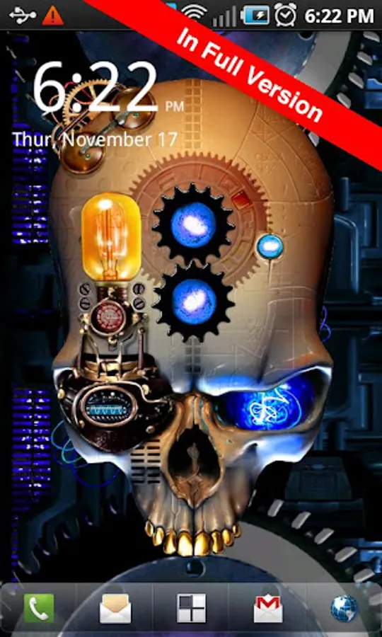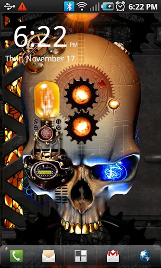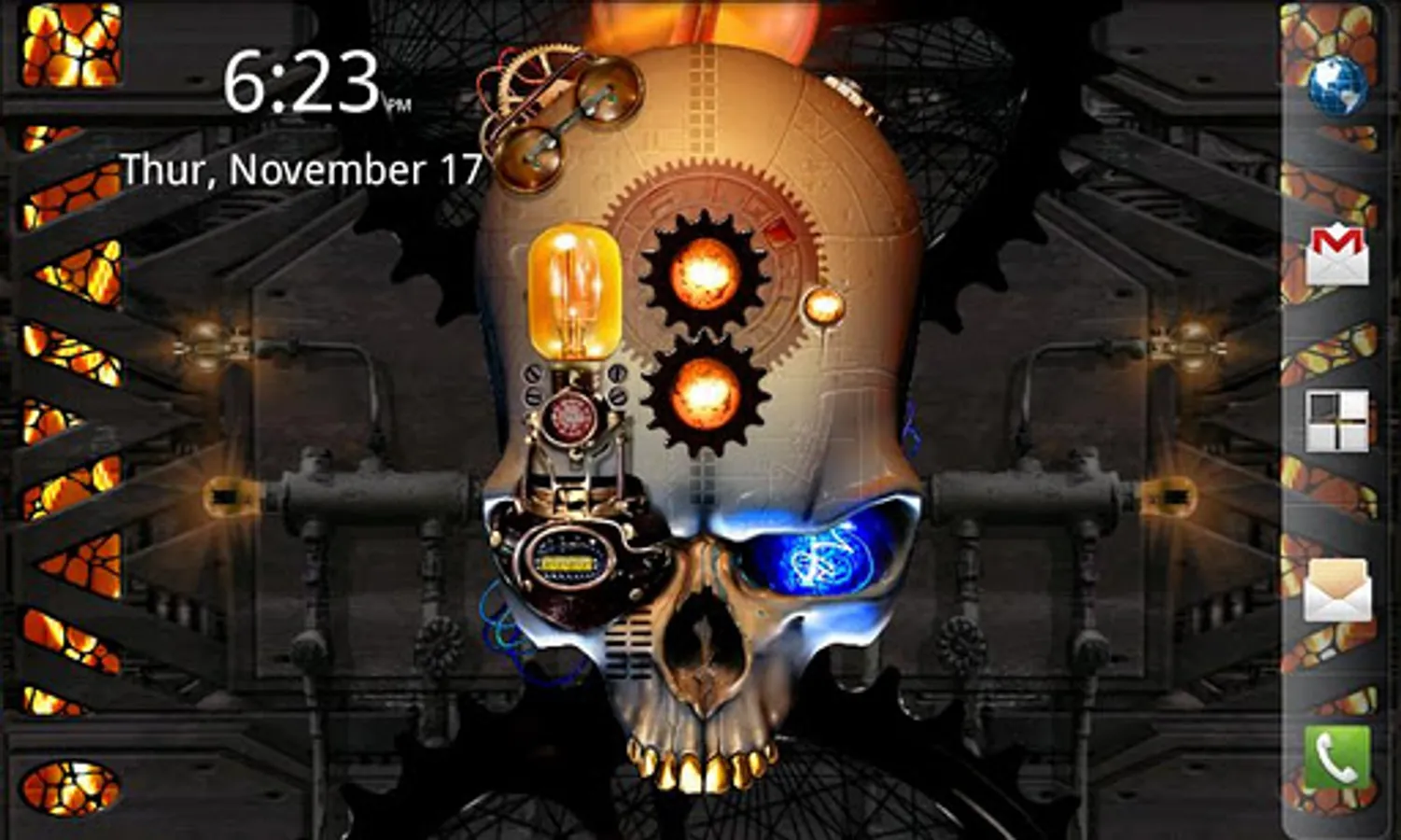 Live Wallpaper featuring a Steampunk skull with rotating gears, animated bulbs, lights, scrolling designs and interactive touch effects. The gears spin and track your finger movements. For fans of steampunk, science fiction, horror, technology, the victorian era, clockwork, and our other skull wallpapers.