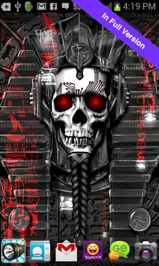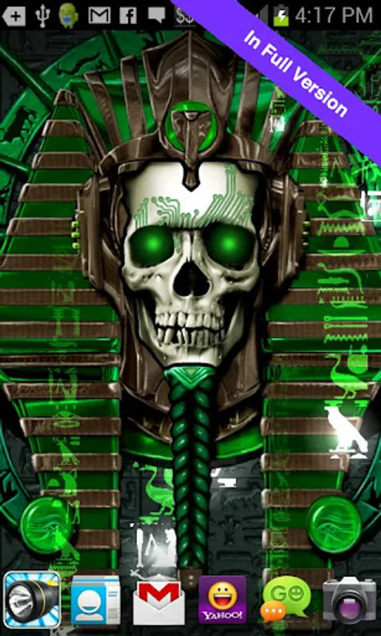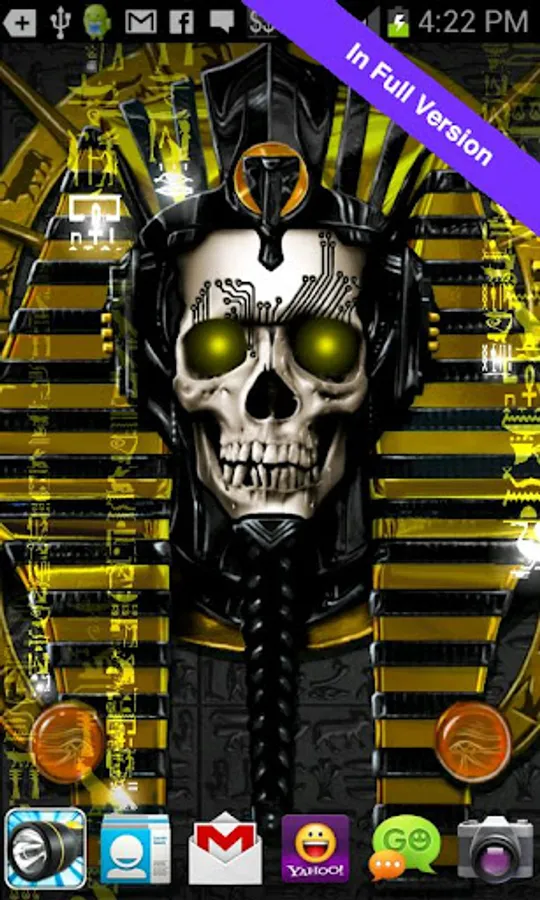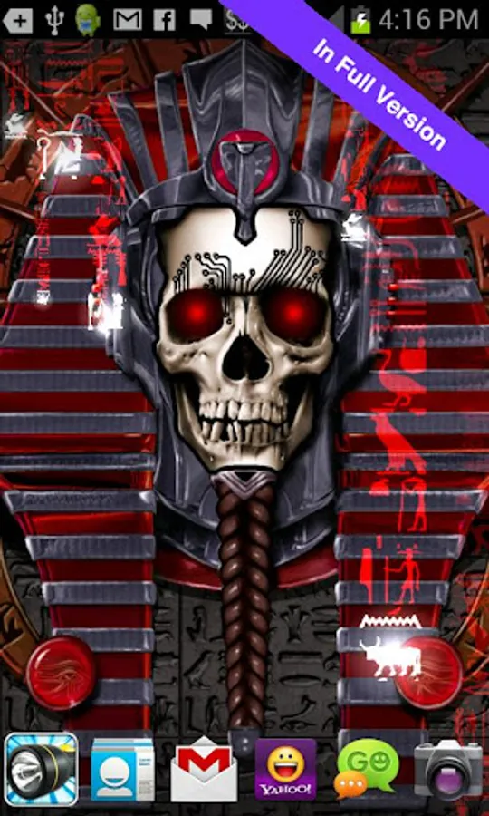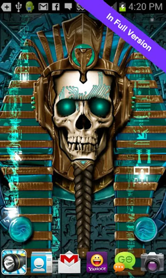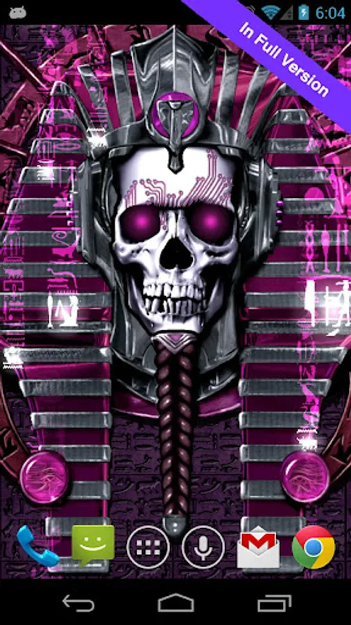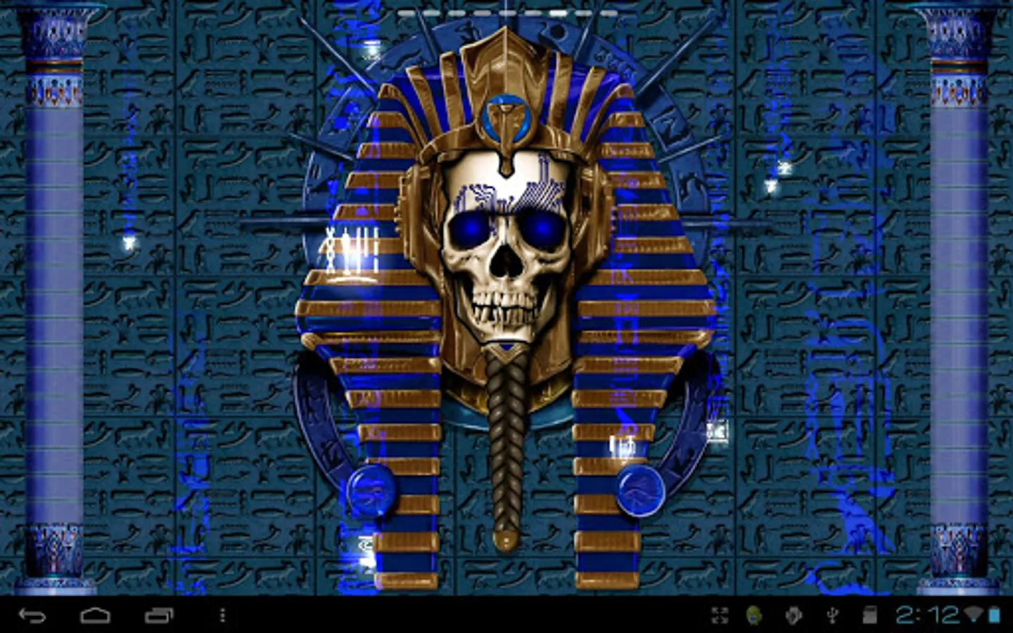 Live Wallpaper featuring an Undead Egyptian Pharaoh skull, animated features, falling "Matrix" style rain hieroglyphics, scrolling tile designs and interactive touch effects. The pharaoh's eyes and circuitry light as you touch the screen.