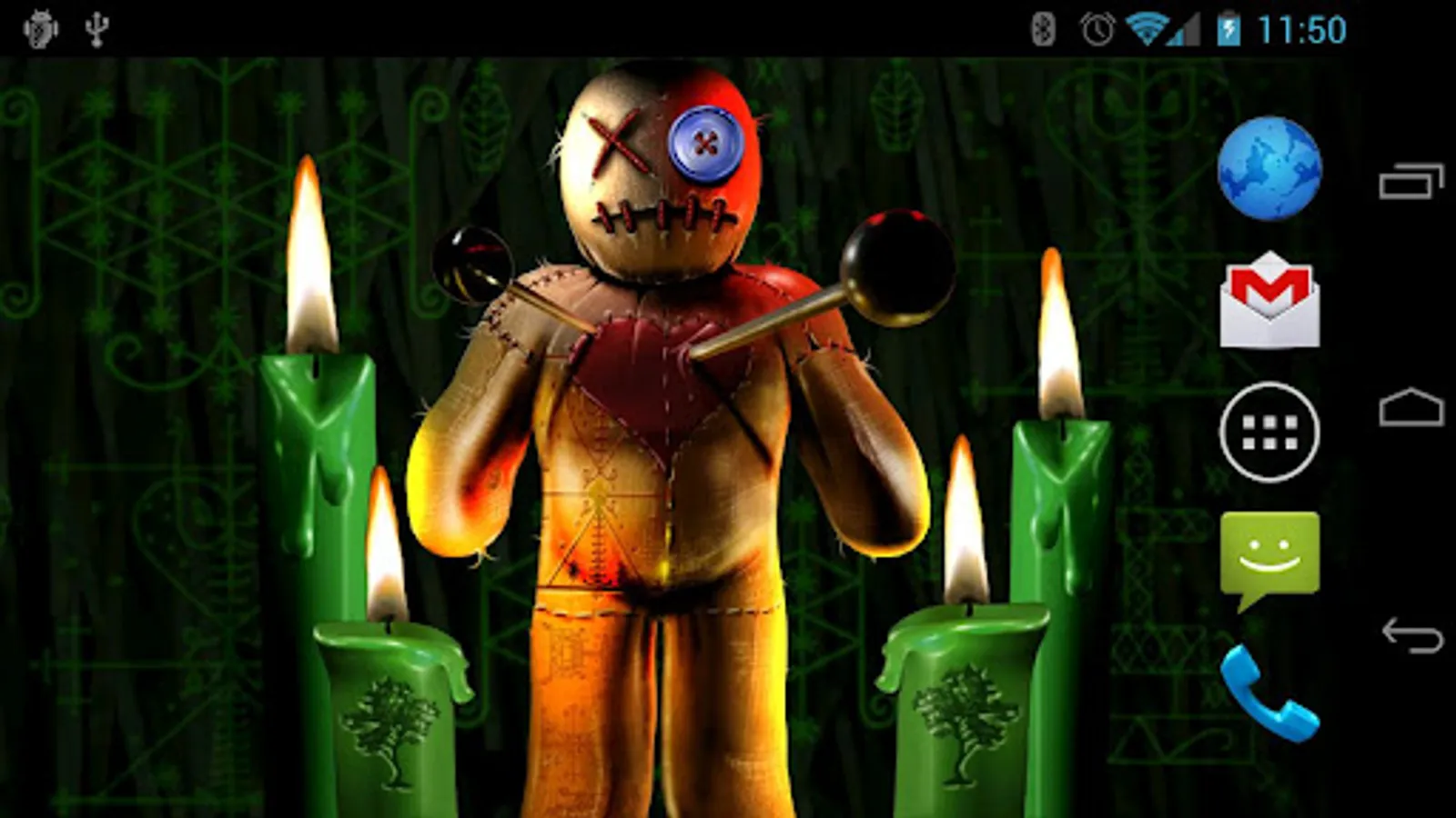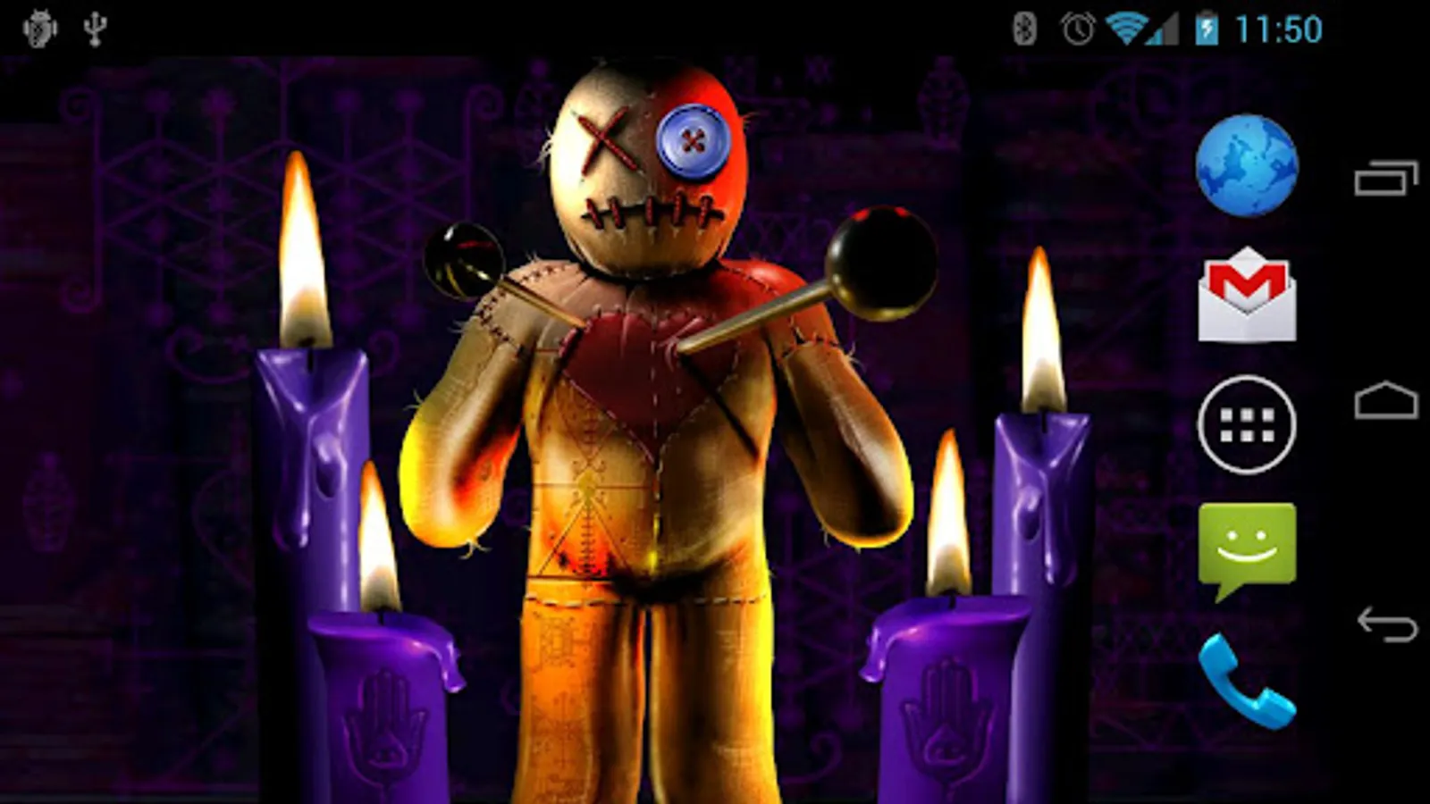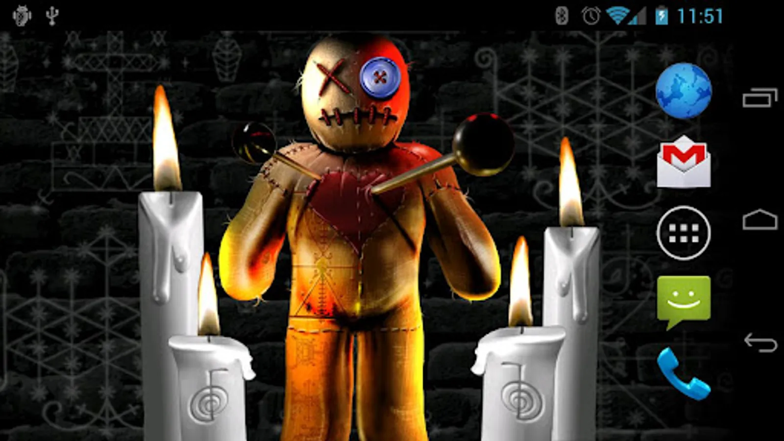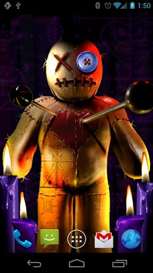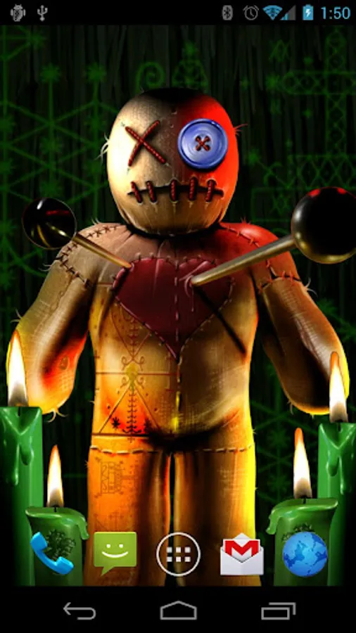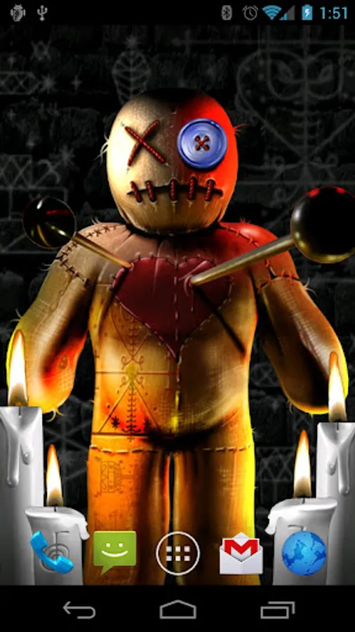 Live Wallpaper featuring a Voodoo Doll with 4 colorful themes, animated candle flames, scrolling veve designs and interactive touch effects. The flames extinguish with your touch and re-ignite upon release. For fans of the occult, voodoo, darkness, horror, and our other original skull, steampunk and dark themed wallpapers.