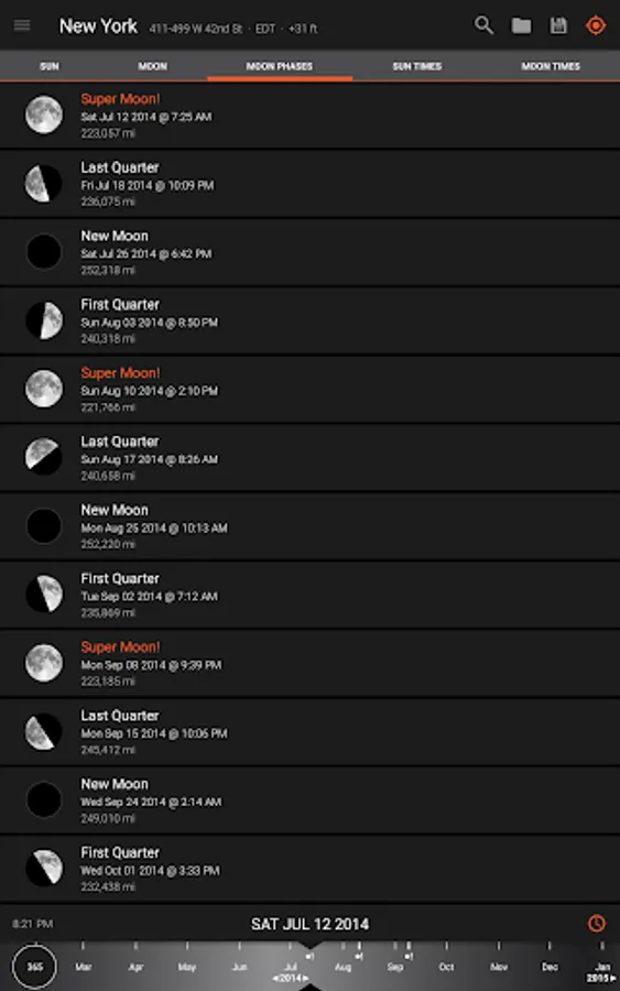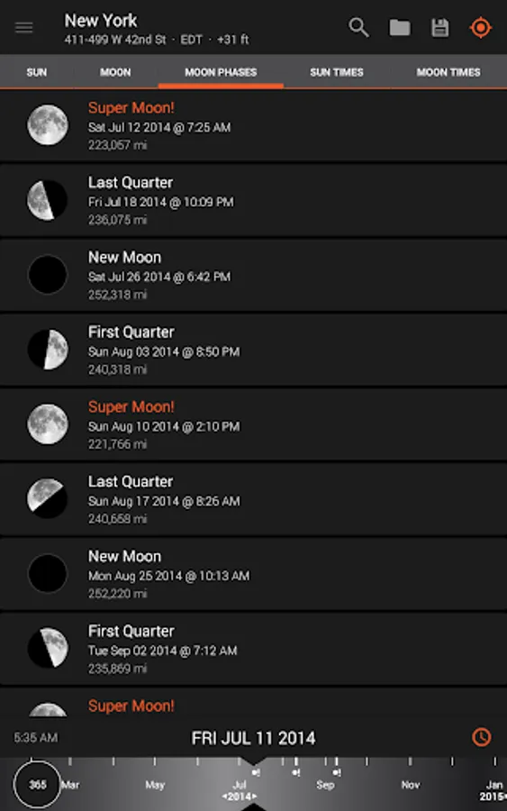 - Moon distance, age, apogee, perigee, super moon predictions
