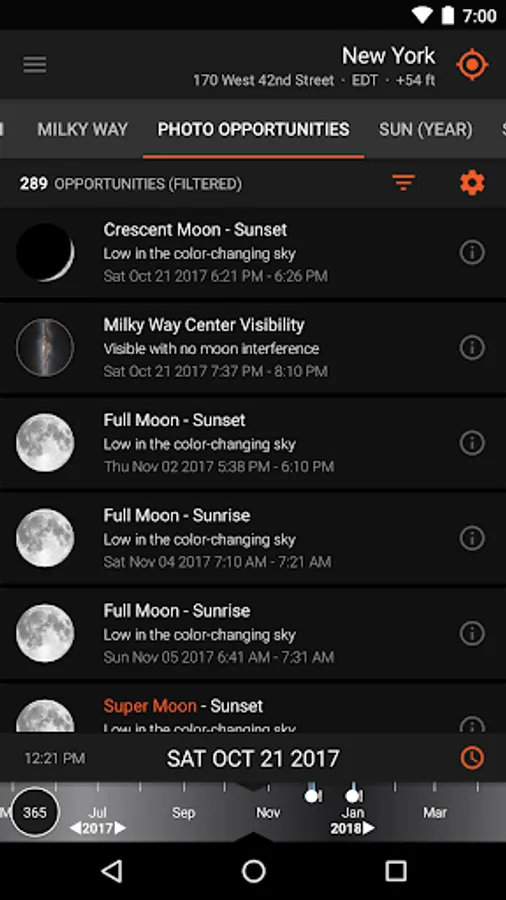 - Photo Opportunities (new!) - an interactive listing of critical times to help inspire and generate shot ideas; including the full moon looming low in the sky during magic hour, total darkness for stargazing, and more