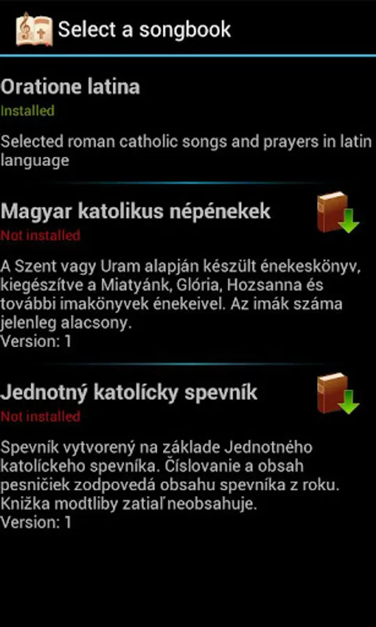 Please note that by default only latin texts are bundled with the app. Additional songbooks can be obtained while inside the application.