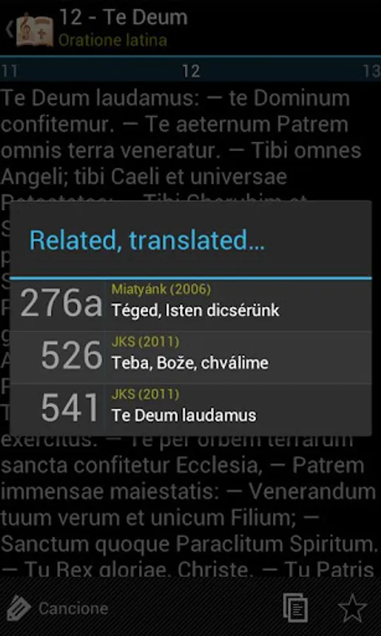 Songs and prayers from multiple books are interlinked with quick navigation possibility if they exhibit a certain relationship (e.g. translation, or different text for the same melody). A handy feature for services in multiple languages or multi-language families.