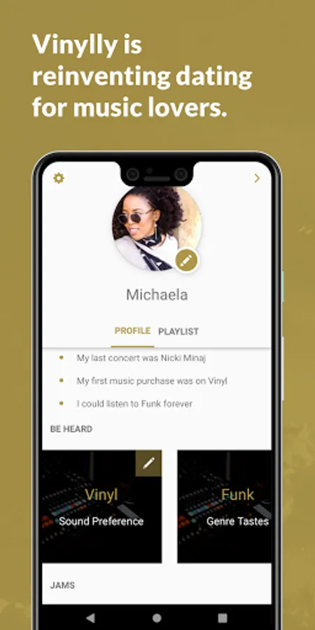 Vinylly is a dating app based entirely on music compatibility. NEW-No Spotify account needed! We are the largest dating app for music lovers and we have just *reinvented* how to use Vinylly. Now, anyone can sign up for Vinylly in a few minutes. No streaming music service sync needed. You can now create an account with your email and password and create a profile using our Vinylly profile generator based on your music tastes alone. When you sign up this way, you can create and edit your playlist too! We have maintained the Spotify sync as a way to create a profile, if you prefer to let your Spotify streaming data do all the work. Lastly, you can still chat for free and we have improved the concert search, suggestions and ticket purchase process in the chat. Beyond just a superficial swipe, Vinylly has the ability to match on a deeper level. And, when you stream more music, Vinylly uses that data to produce new matches. Vinylly’s “Suggest a Concert” feature encourages users to stop chatting and start dating, which offers a better chance at finding real relationships. Vinylly learns to understand you by learning about the music you love – and in doing so, puts the needle on true compatibility.