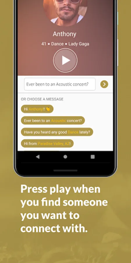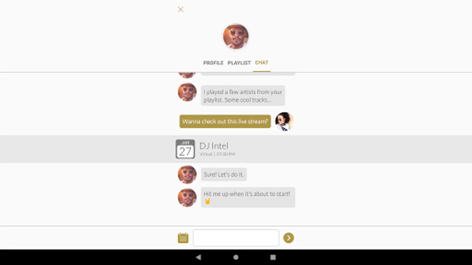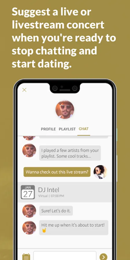 Vinylly is currently free to use. Use the provided conversation starters with references to a potential match's profile to get the conversation going. Want to continue the chat? Upgrade to Gold for free and start chatting back and forth. Think you want to take the next step and ask your match to see a show? You don't have to leave the chat--just click the calendar icon and select a virtual concert or live show based on an artist or a location and the show will appear in the chat.