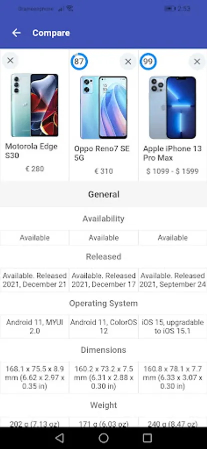 Mobile Price and Specs is an application where you will find the specifications of all the top selected smart phones of top brands like Apple, Samsung, Sony, Motorola, Xiaomi, Huawei and many more. Compare and analyse the technical features and then figure out which phone to buy.