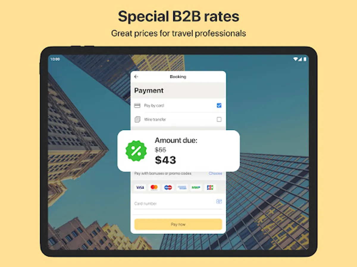 Puedes escoger entre más de 1.300.000 hoteles, pensiones, hostales y apartamentos con precios fantásticos para clientes corporativos y agencias de viajes. Trabajamos con los principales proveedores de inventario y con decenas de miles de hoteles directamente. Esto nos permite ofrecerte las mejores tarifas y ahorrarte dinero.