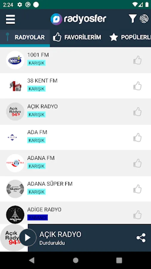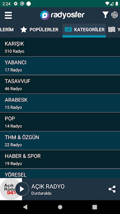 We gathered all the radios under pop, arabesque, foreign, news-sports, slow, folk music, nostalgia, religion, rock, rap and local categories.