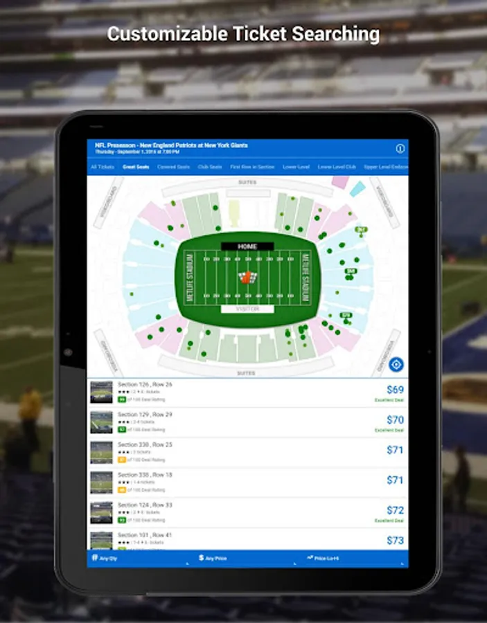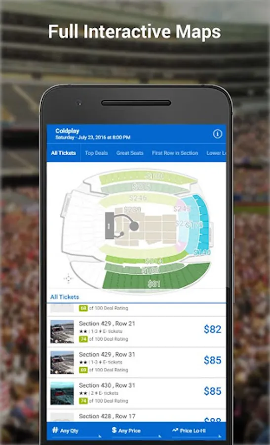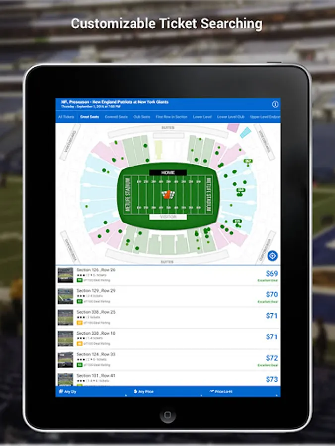 • Quickly sort millions of tickets by SeatScore™, Deal Rating, Price or Location