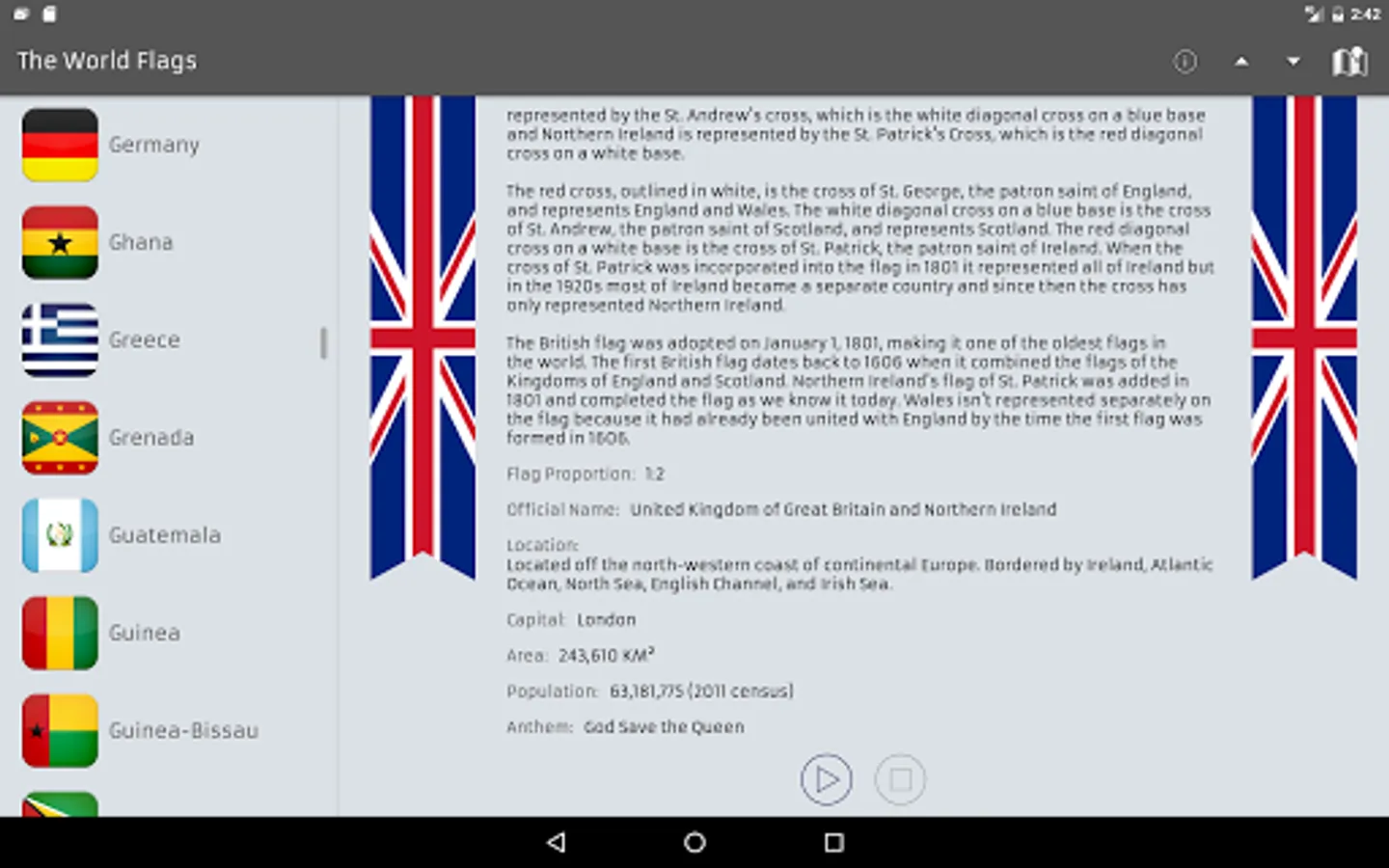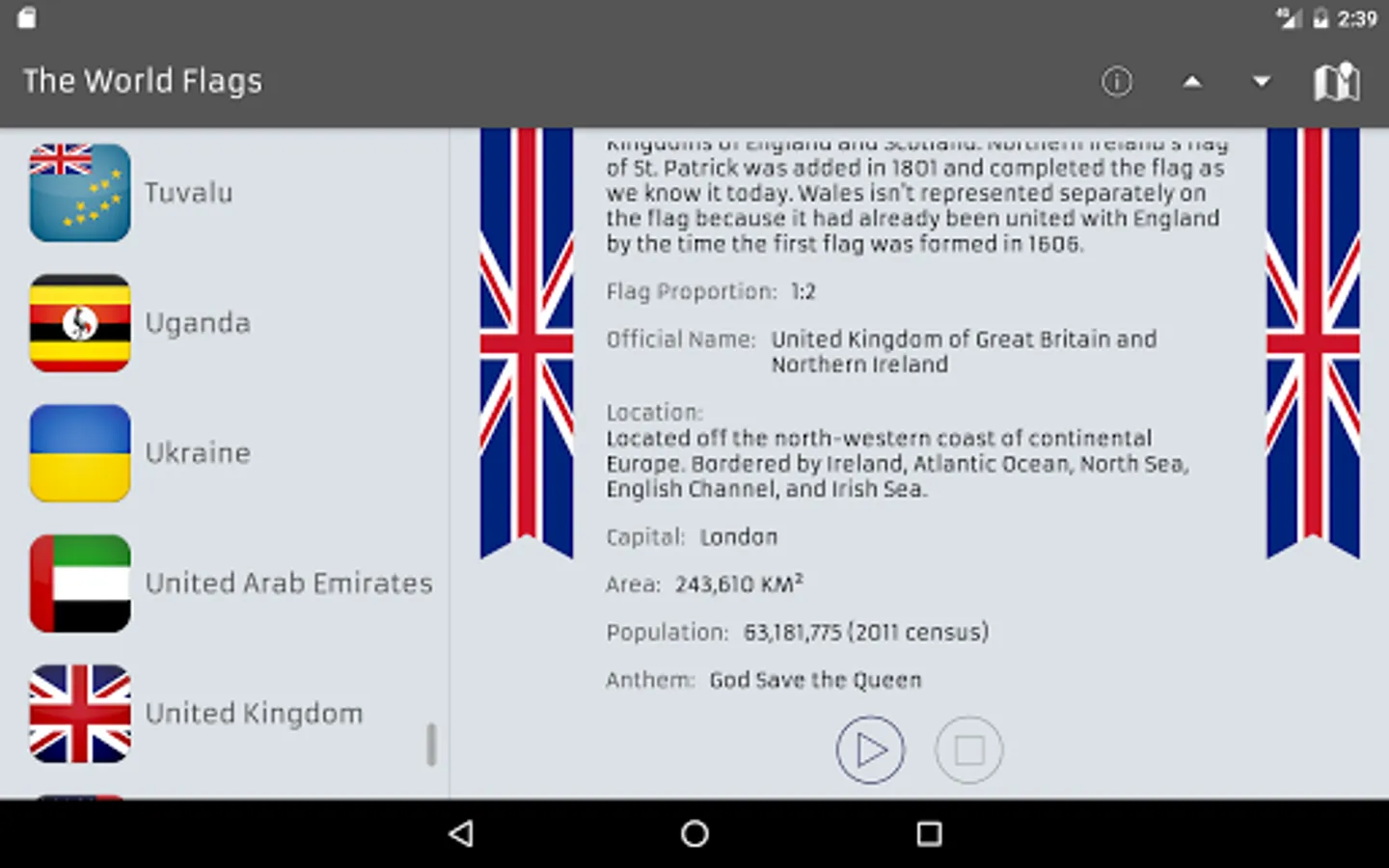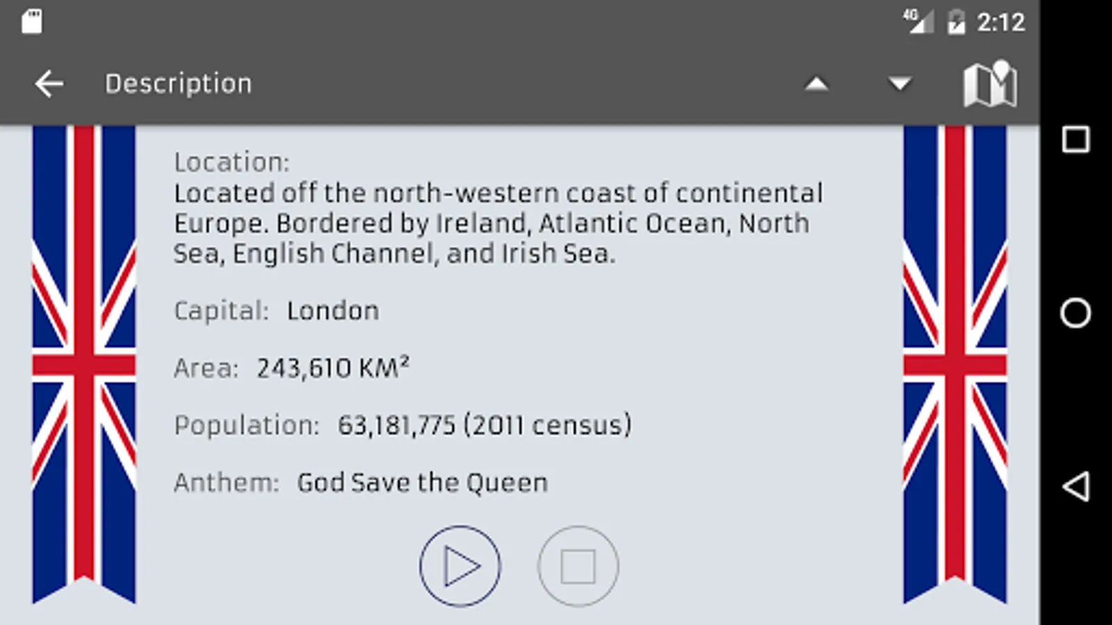 Even more, know about each country official name, the capital name, where is each location locations, how big is their countries, what is its population, as well as listen to the national anthem.