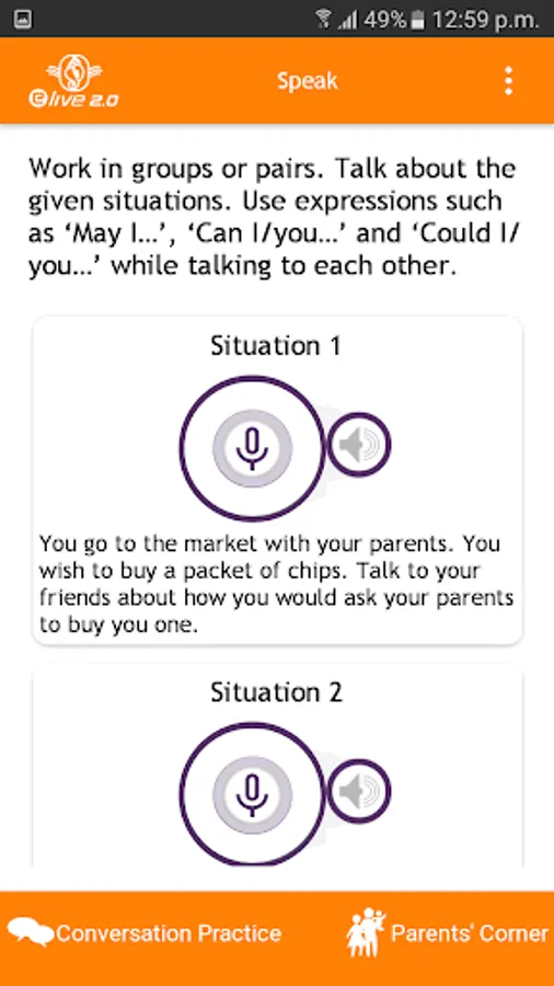 To enhance one's conversation skills, one must use the conversation practice asset for listening, practising and speaking. There are three sets of conversation practice in the app. Each set consists of a pre-recorded conversation, questions based on the conversation and additional questions to help the user practise similar conversations.