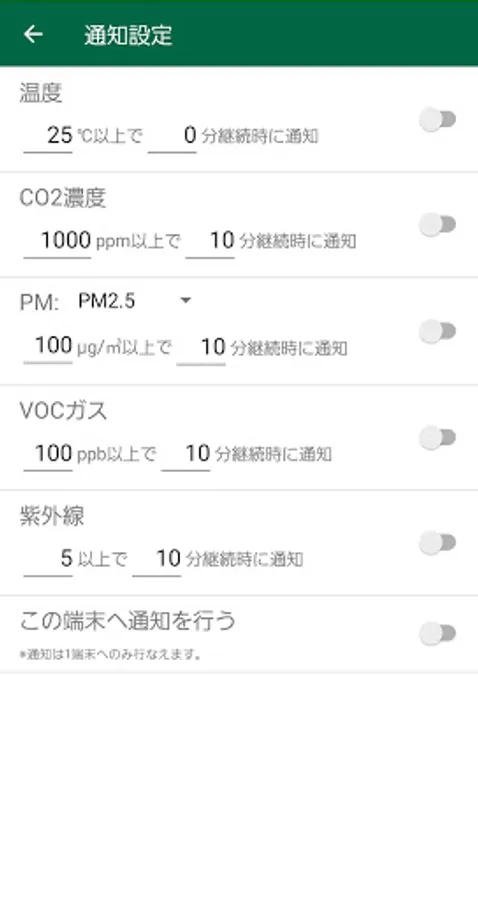 ● Notify the smartphone when the measured value of CO2 or VOC exceeds the specified value