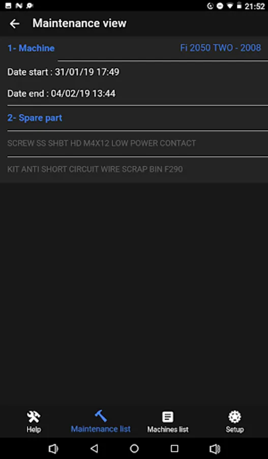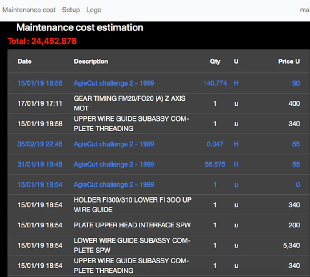 maintenanceCost app calculate hours, days, and spare parts used during maintenance performed by an agent. The app shows exact total of maintenance cost.