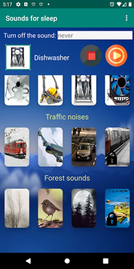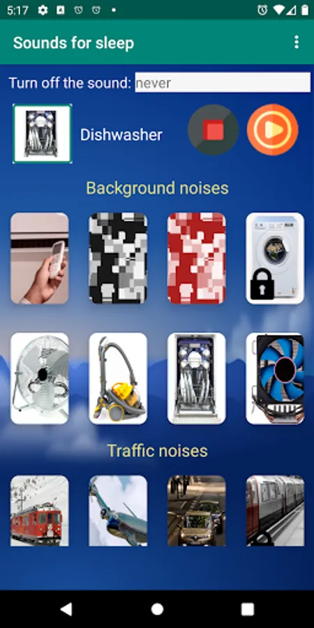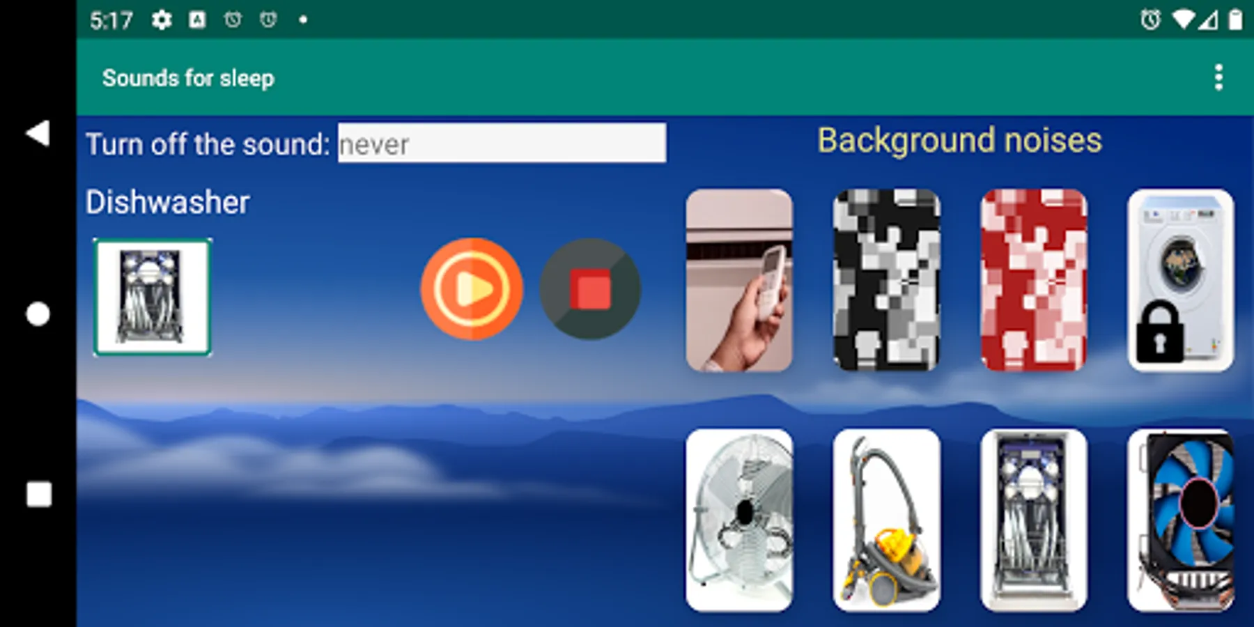 This application simulates background sounds. It contains: white noise, pink noise, the sound of a dishwasher and other household sounds. There are also sounds of city traffic and sounds of the forest.