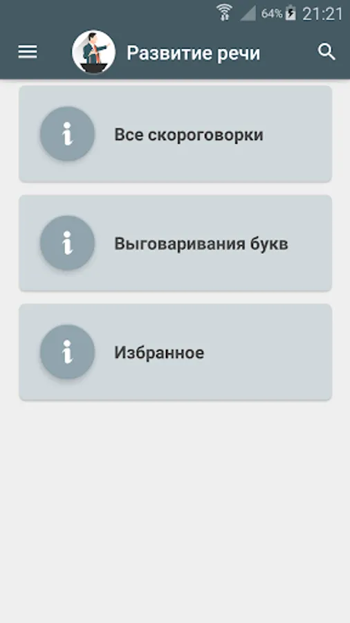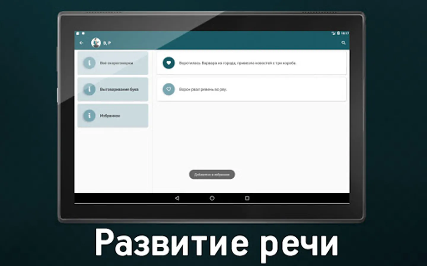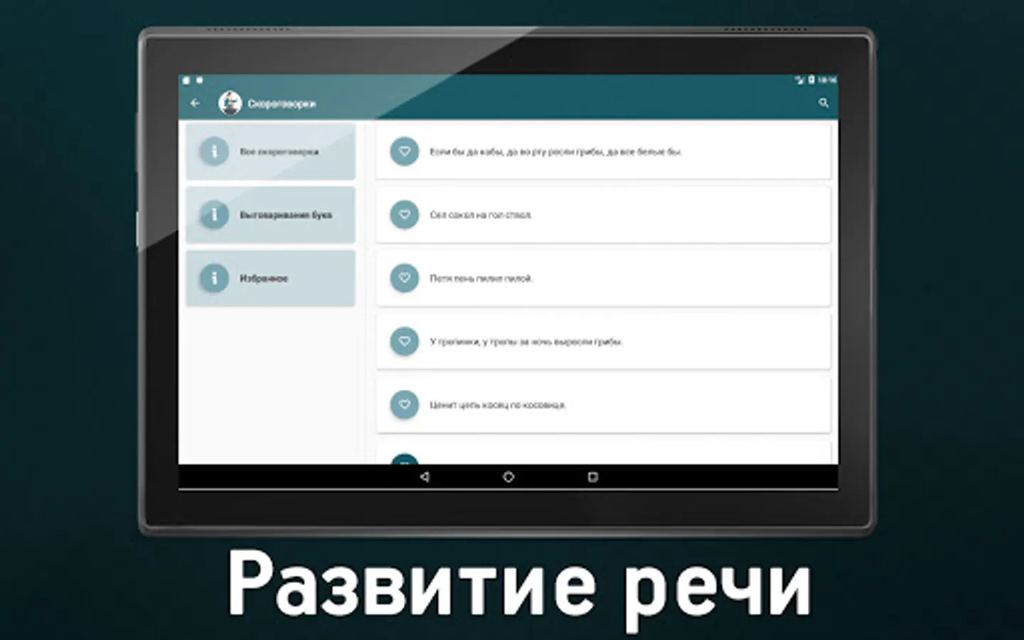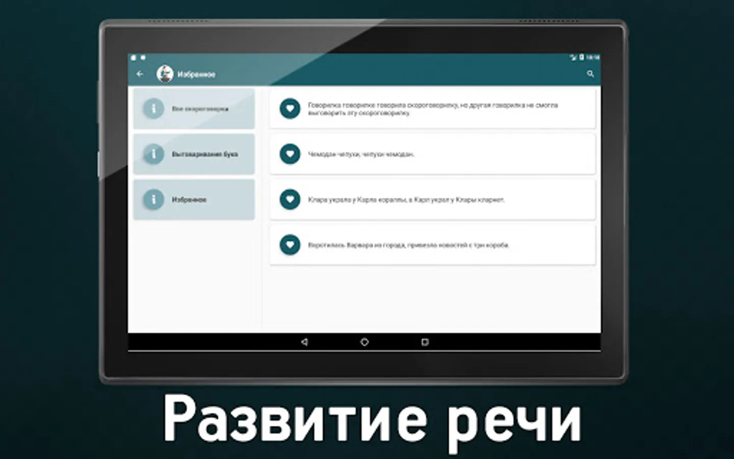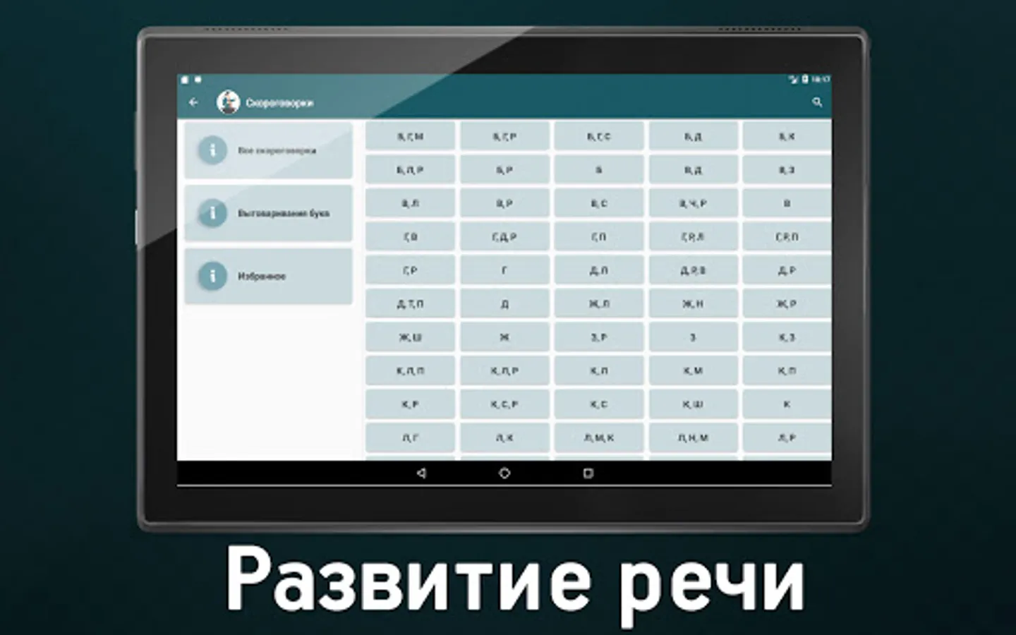 In the application "The development of speech. Skorogovory", collected 500 popular patters, divided into categories, where you can choose certain letters that you want to learn to pronounce correctly.