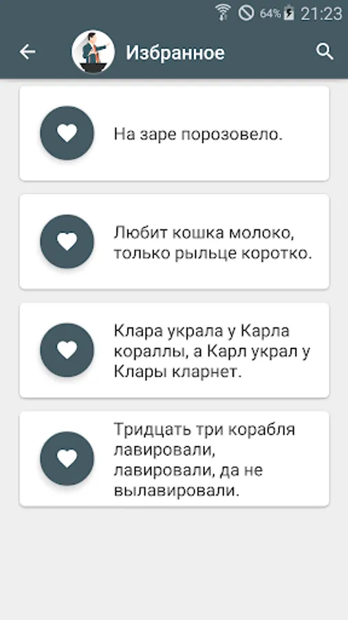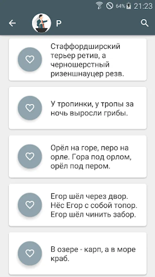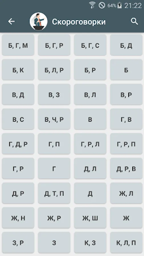 For example, if you want to learn how to pronounce the letter P correctly, you choose the necessary category, where the tongue-twisters will be chosen precisely for the development of the pronunciation of the letter P.