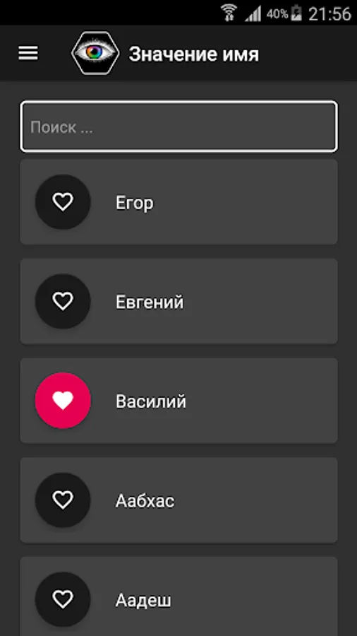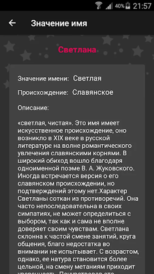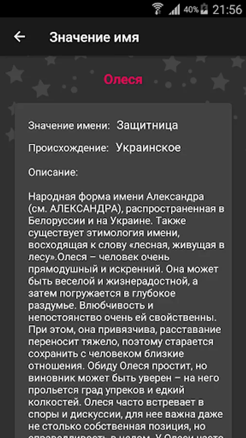 An application with which you can find out the meaning of a person’s name, find out by name the person’s character and what that name means.