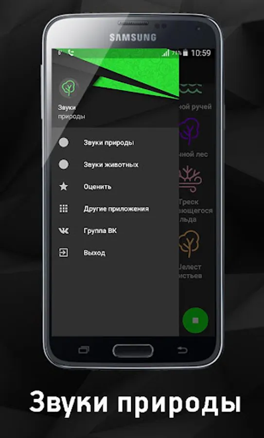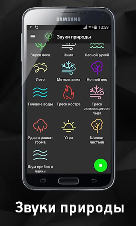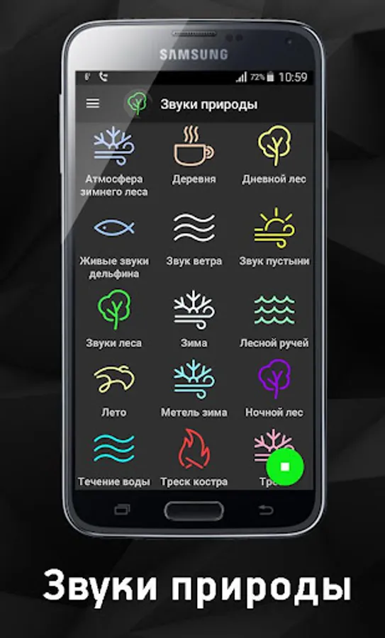 This application contains the "Sounds of Nature". Such as a forest stream, the sound of the surf and seagulls, the sounds of winter, desert, forest and so on. Using the Sounds of Nature app, you can create any mood. So perfect for relaxation or if you just want to create the right atmosphere.