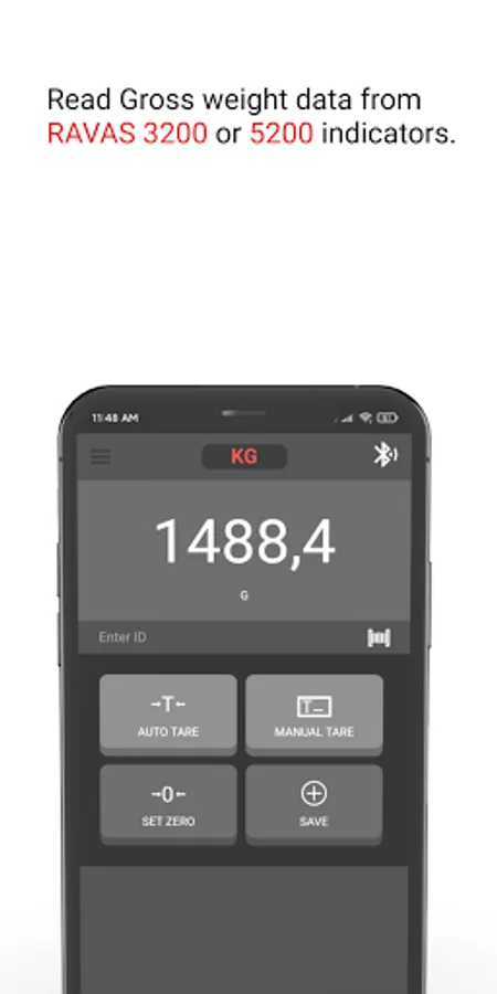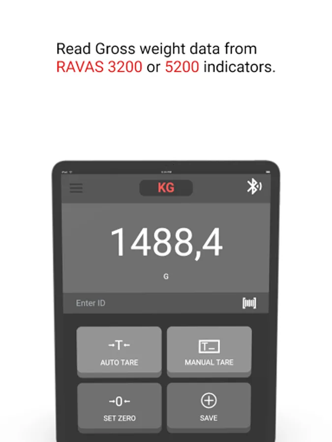 The RAVAS WeightsApp works with RAVAS 3200 and 5200 indicators, both with Bluetooth 4.0 (BLE) data output. Once paired with the RAVAS indicator, the gross weight can be read directly on the APP. Tare weight can be entered in the APP as well as ID codes for Product and operator. These weight data are stored locally on the smartphone or tablet. You can view this list of data at any time and if required also send it by email to any email address. This list of data is sent as a CSV file and can be converted into a spreadsheet program of your choice on the PC.