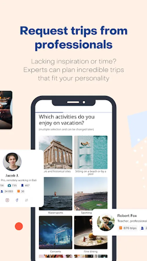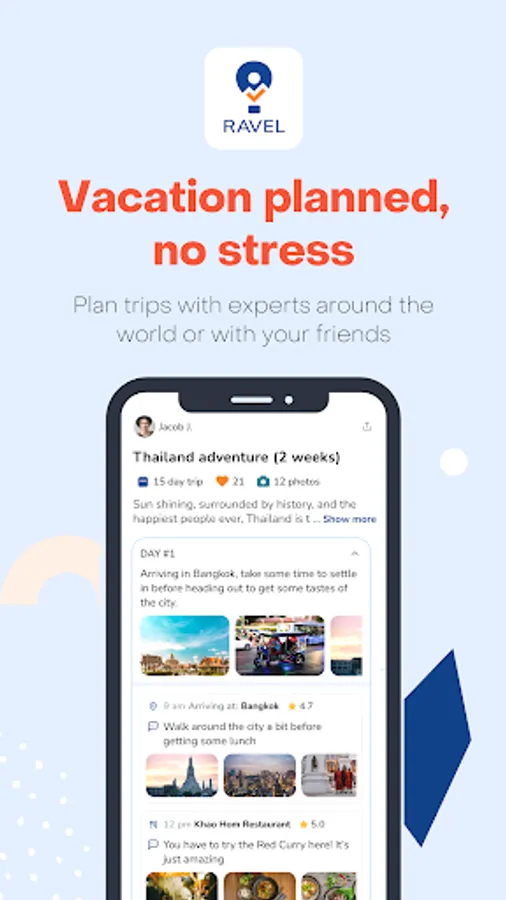 With Ravel trips, you can access worldwide experts who are ready to help make your dream vacation come true. Make a trip request to get a fully personalized trip crafted by a travel expert in the app or plan a trip on your own with the help of the community.
