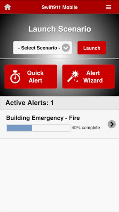 Users can use the scenario section of the app to select an alert scenario and launch it immediately.