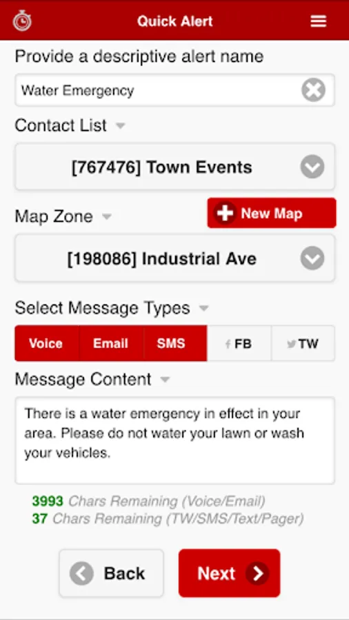 Alert Wizard provides multiple steps allowing the user more alerting options. Contact lists can be filtered by a map and/or custom filters. Message types supported are Voice, Email, SMS/Text, Pager, Fax, Facebook, Twitter and Hot-line.