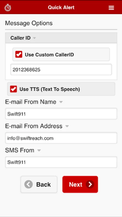 Quick Launch allows a user to enter an alert name, select a contact list to send the alert to with the added feature of only sending the alert to those people within a specific, defined area on a map. Message types include Voice, Email, SMS/Text, Facebook and Twitter. The user enters custom message content and can specify a caller ID number and then launch the alert.