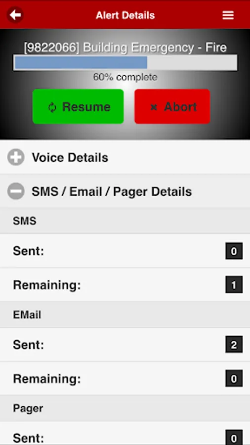 Any scheduled or running alerts will be displayed on the home screen along with a progress bar. Details for each alert can be viewed and running alerts can easily be paused/resumed or cancelled.