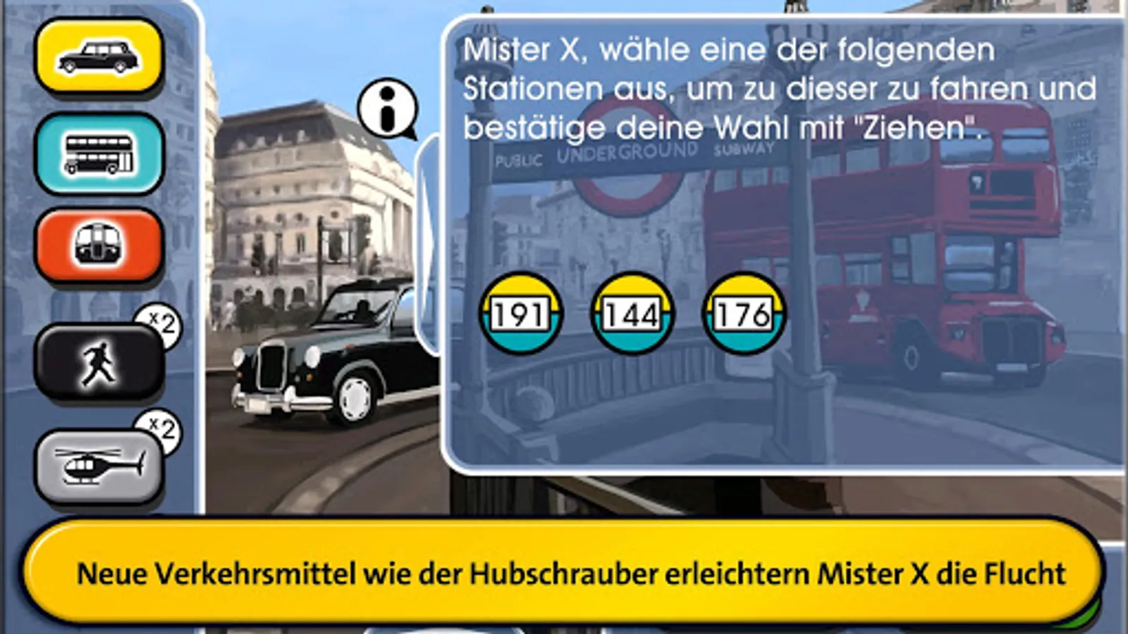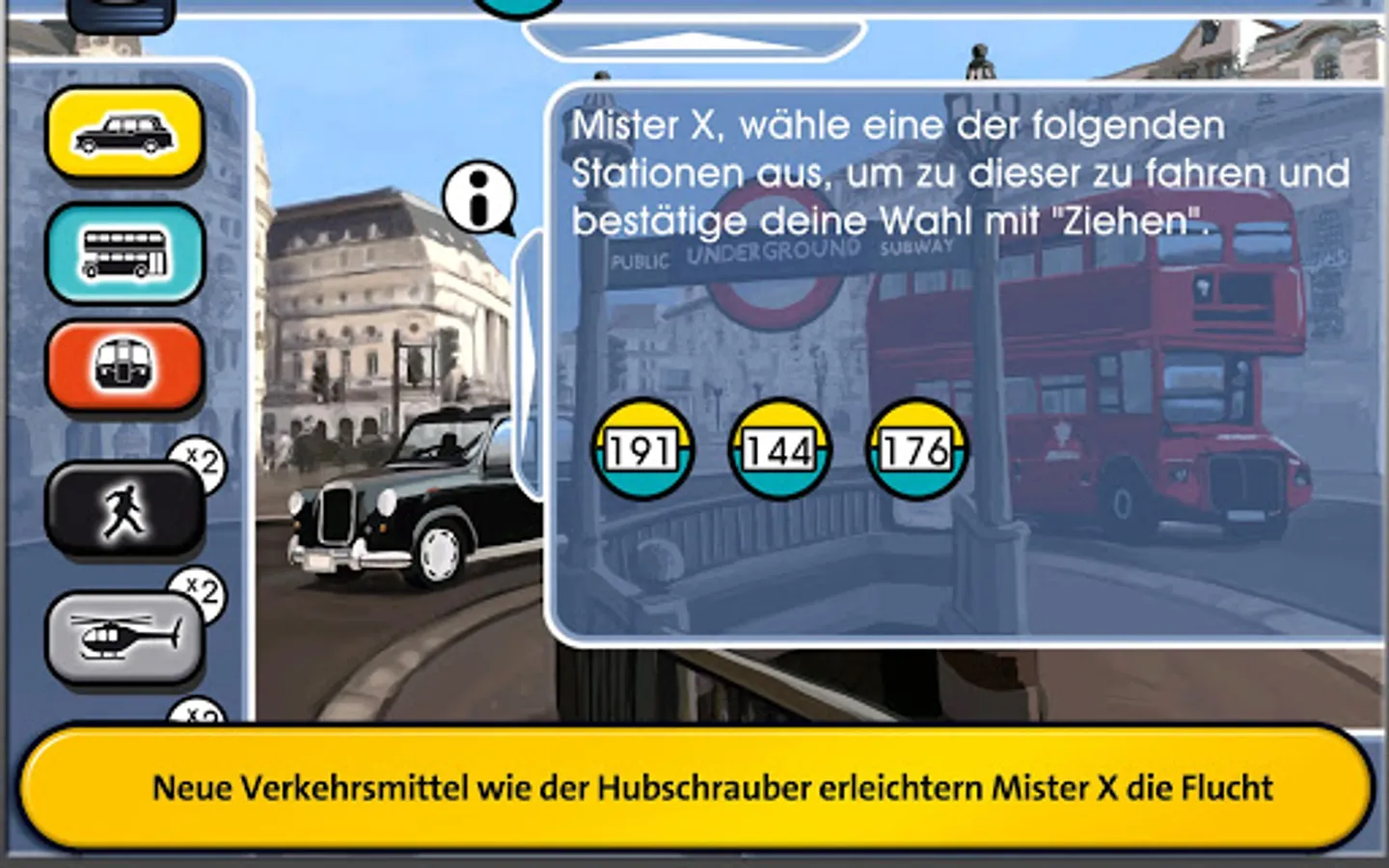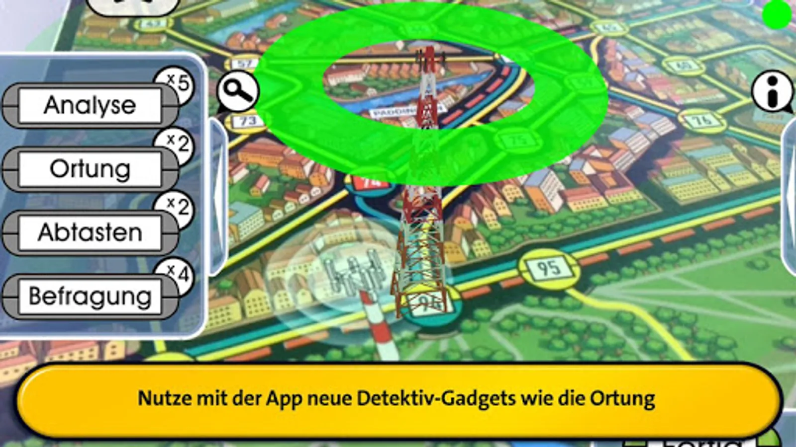 Together with the board game, this app offers a completely new and even more exciting way to play. The detectives are on the cutting edge of technology and even hotter on the heels of Mr X. They will find all the important information in the digital control centre: Which modes of transport has Mr X travelled by so far? When will he show himself again? What special actions can be used? You can select mobile phone tracking, for example, and point the smartphone or tablet’s camera at the four radio masts on the game board. Green, yellow or red radio waves will indicate whether or not Mr X is nearby. You can also question witnesses at important buildings across the city. The camera comes into play again, showing Tower Bridge, the Houses of Parliament and St Paul’s Cathedral in 3D. Witnesses will reveal whether Mr X is or has recently been there.