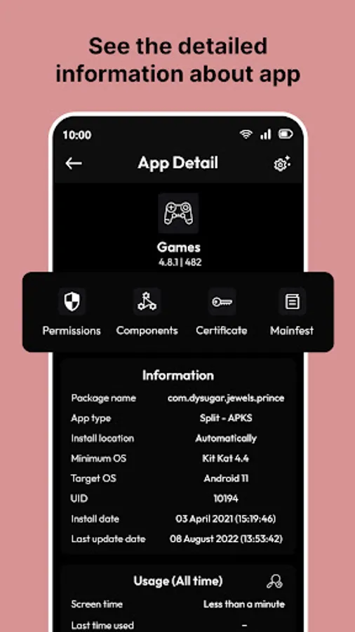 - You can get the information of all components used by the app including activities, services, broadcasts, providers, etc...