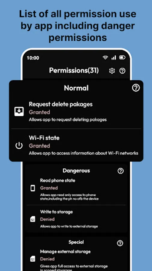 • READ_EXTERNAL_STORAGE/WRITE_EXTERNAL_STORAGE - finding APK files to install/remove them