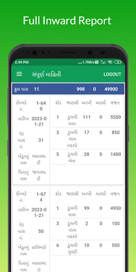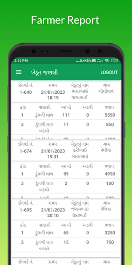 This application provides various kinds of reports for Items, Farmers, and Agent, based on Inward Entries captured at the Gate of APMC Talaja Marketing Yard.