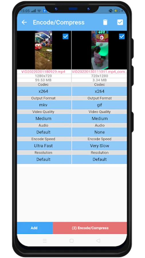 Support output format AVI, GIF, MKV, MOV, WMV, MP4. Codec support x264 and x265, options disable audio, change resolution, video quality, encode speed (very slow, slower, slow, medium, fast, faster, very fast, super fast, ultra fast). Compress video to very small size, freeing up a lot of memory space on your device. No duration limit and can convert multiple video unlimited.