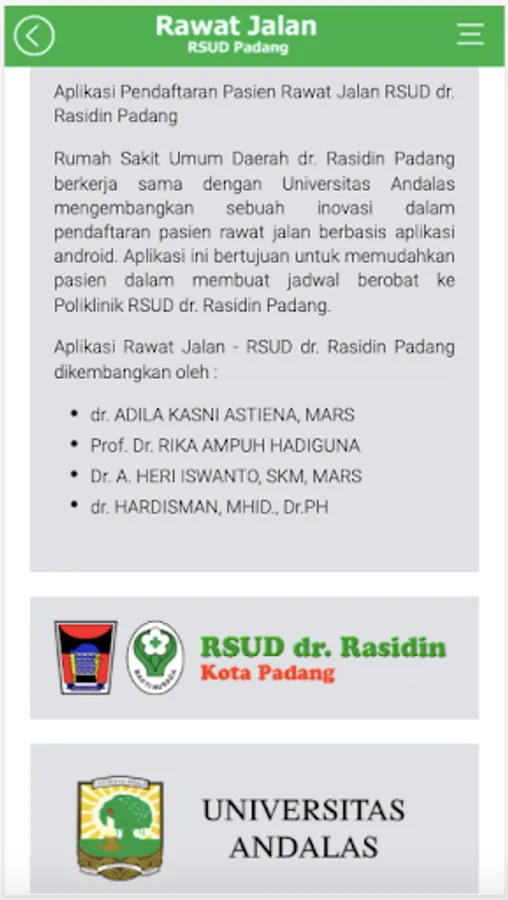 Regional General Hospital dr. Rasidin Padang collaborates with Andalas University to develop an innovation in outpatient registration based on an android application. This application aims to make it easier for patients to schedule a treatment at the Polyclinic of dr. Rasidin Padang.