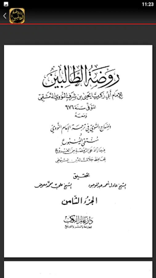 Rawdat al-Talibeen wa Umdat al-Muftin, which is an abbreviation of the book Al-Sharh al-Kabir by al-Rafi’i, is one of the approved books in the Shafi’i school of thought, and it contains an expansion in presenting jurisprudential issues.