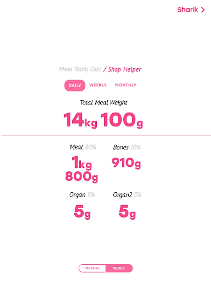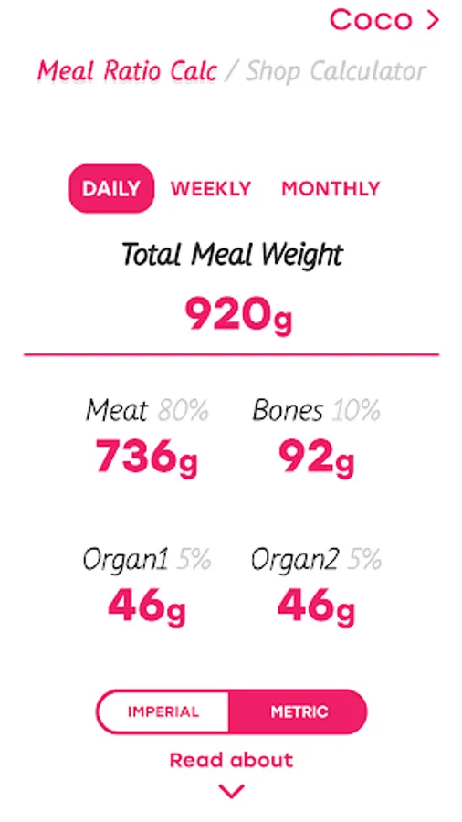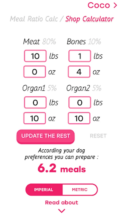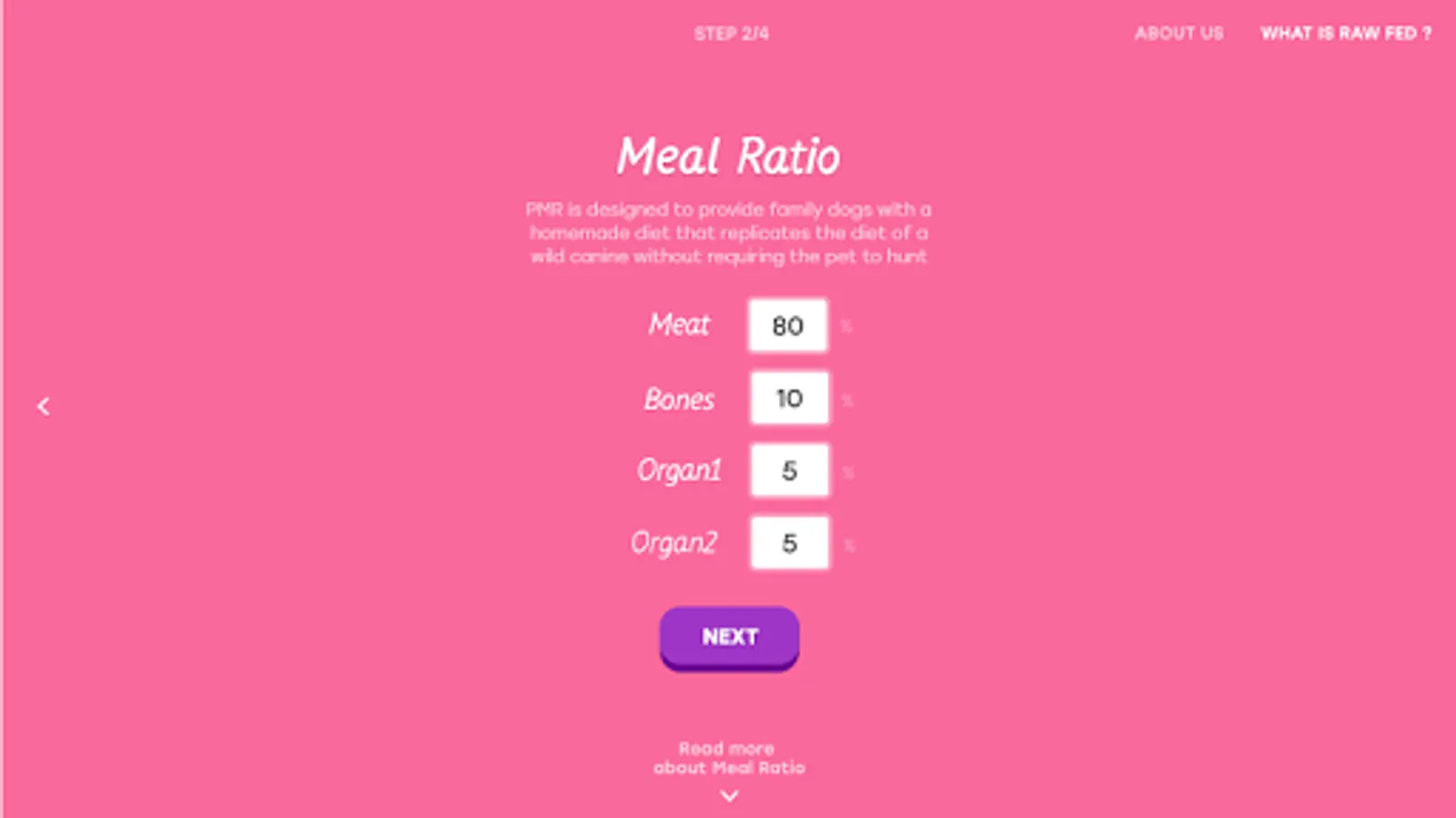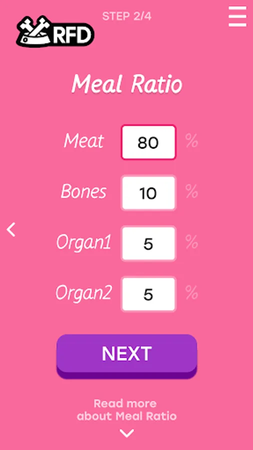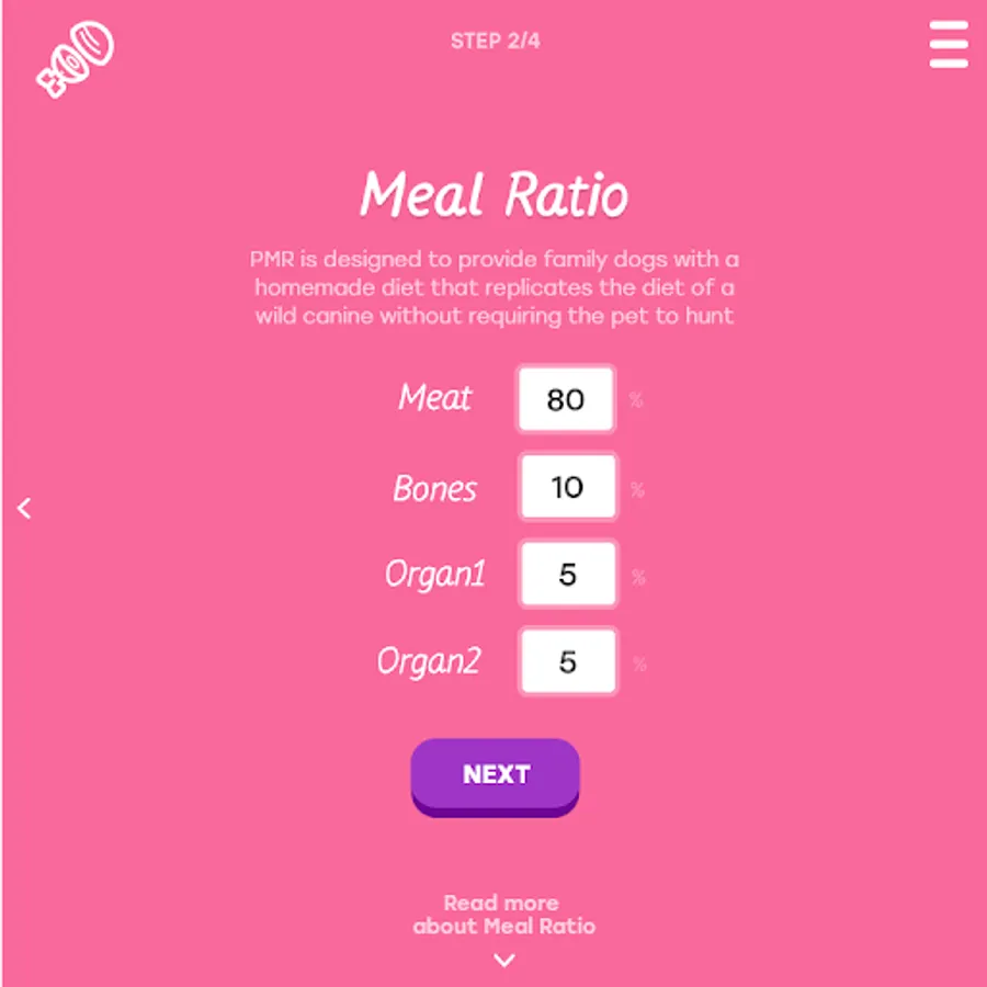 Shows you the Ratio breakdown of the meal between Meat, Bone and 2 types of Organs. You will have to enter the dogs weight and meal weight ratio to get correct information