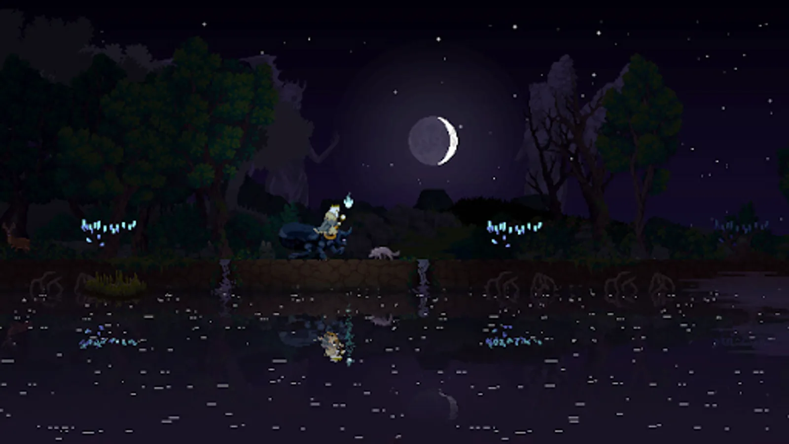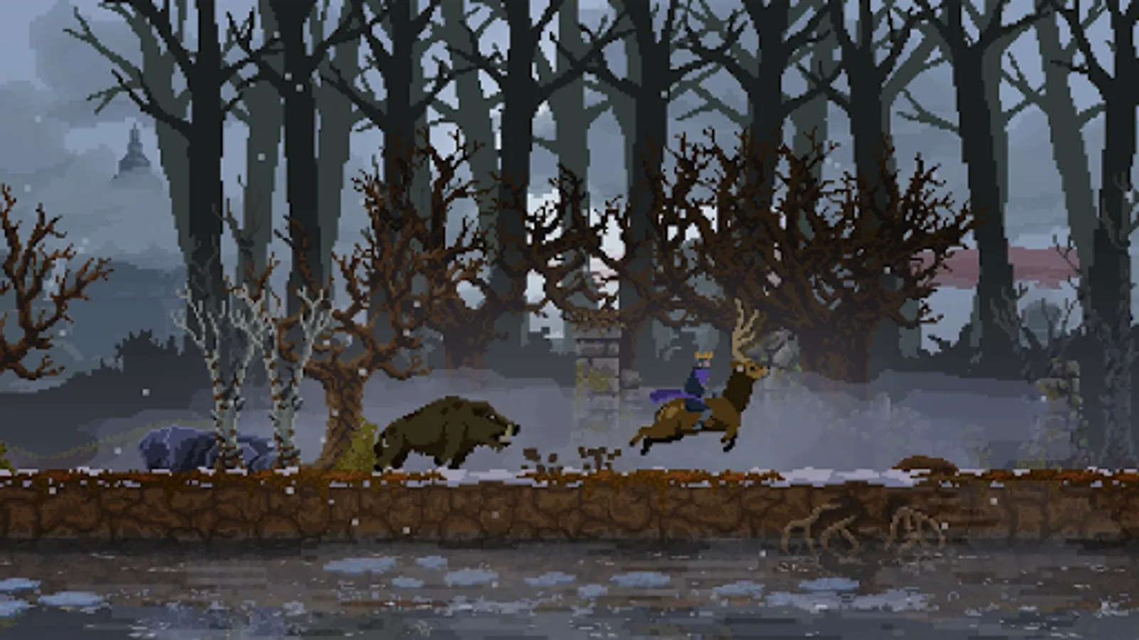 "Kingdom Two Crowns is a side-scrolling micro strategy game with a minimalist feel wrapped in a beautiful, modern pixel art aesthetic. Play the role of a monarch atop their steed and recruit loyal subjects, build your kingdom and protect it from the greedy creatures looking to steal your coins and crown.