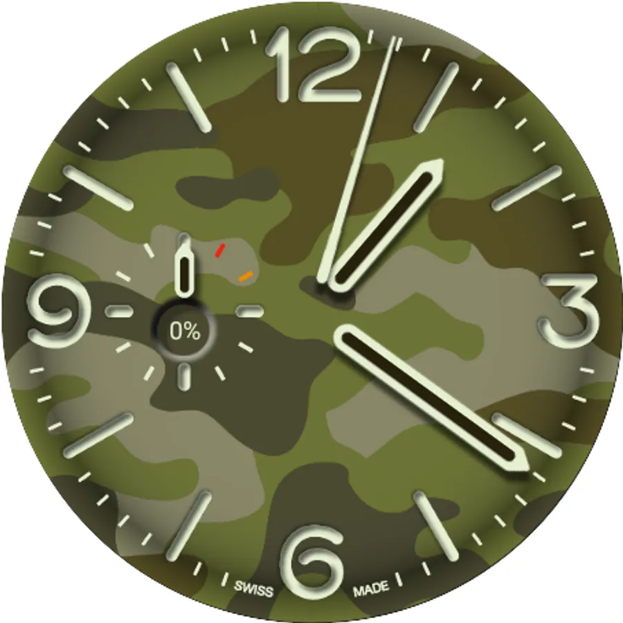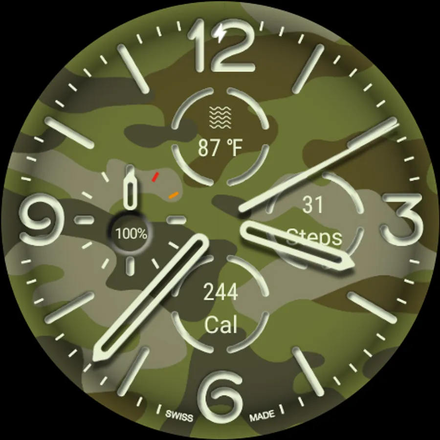 This watch face offers 3 fully customizable complications, a dedicated battery indicator, up to 9 colorways – world's most iconic camouflages types – and 5 colored ambient mode in its premium version.